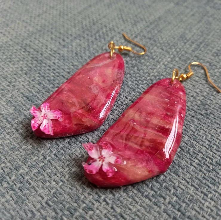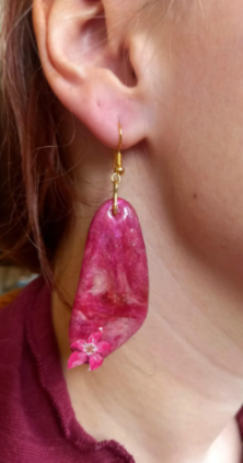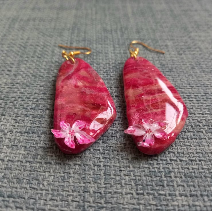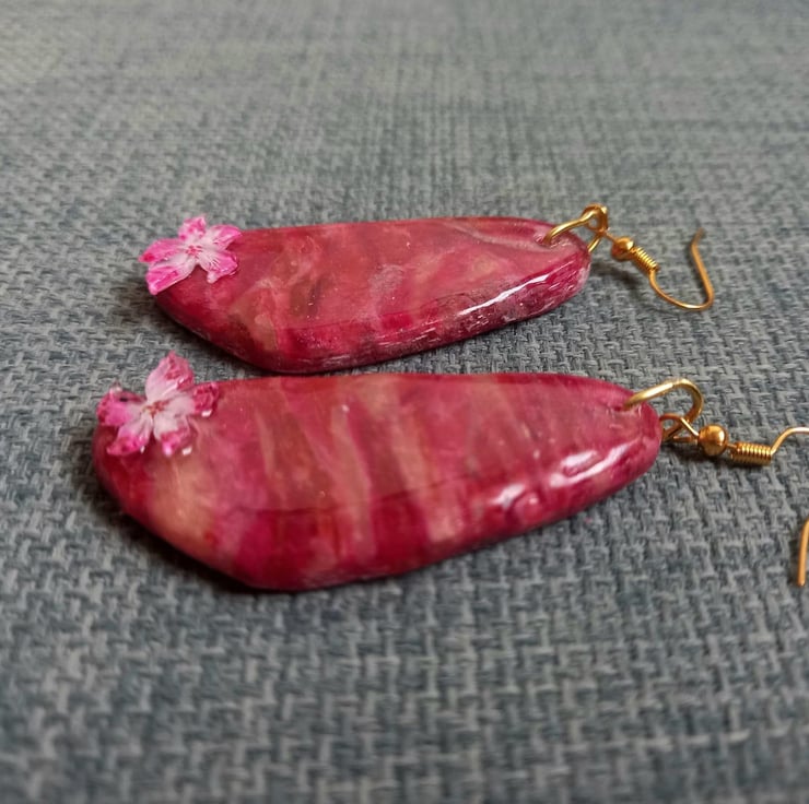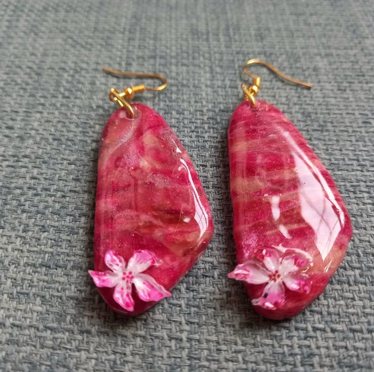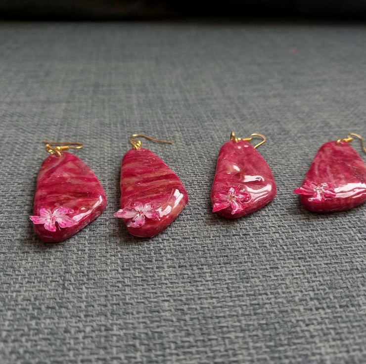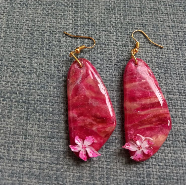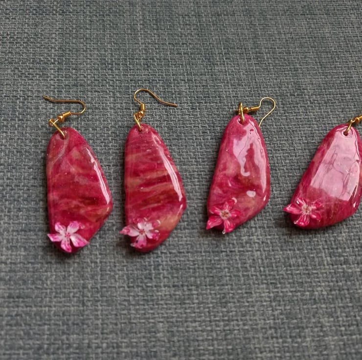 These earrings have been handmade with polymer clay and UV resin. The colour is created with different variations of red alcohol inks, mica powders and paint, which is marbled and cut into shape. The top layer of resin is then added to give it that shine and hangs from a copper wire.