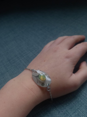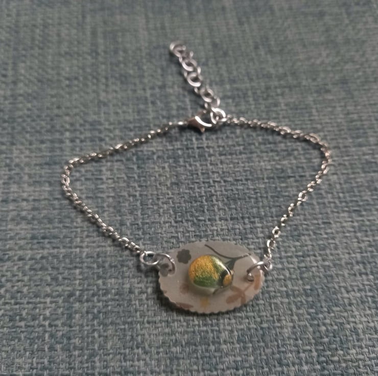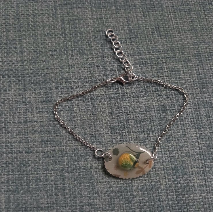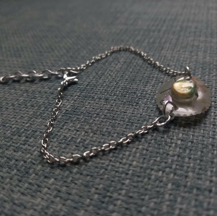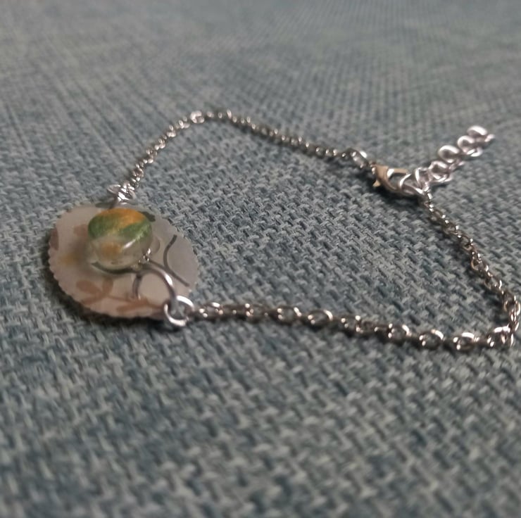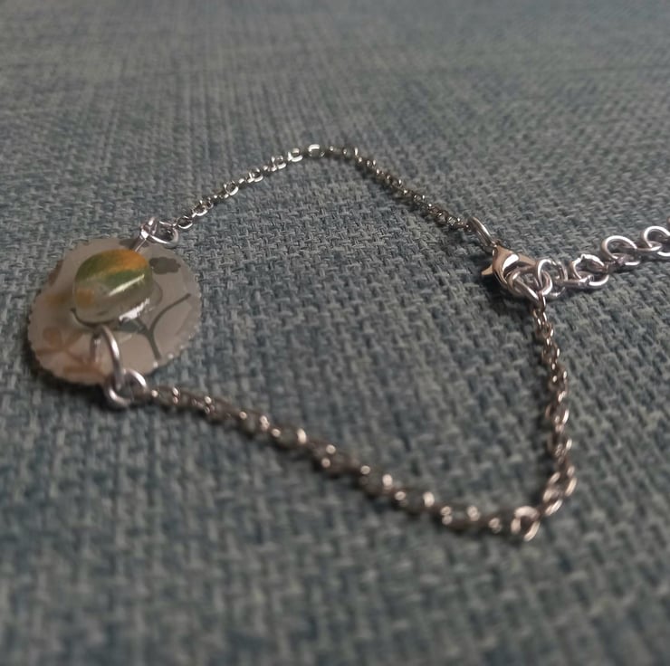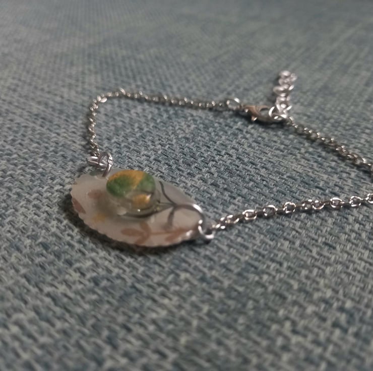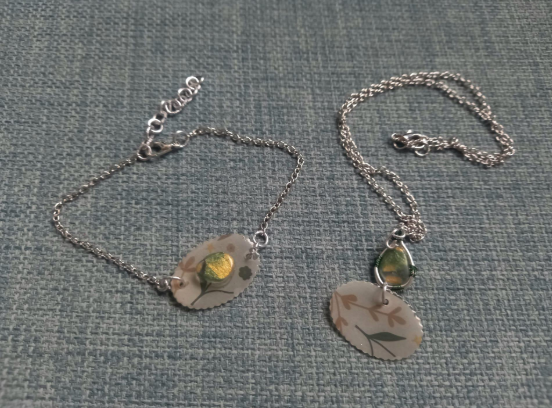 These bracelets have been handmade with UV resin and card. The card is a pale green with brown and bronze leaves and have been cute into oval shapes. The resin gives them that shine and the gem alongside it is also made from resin. They hand from a stainless steel wire and chain.