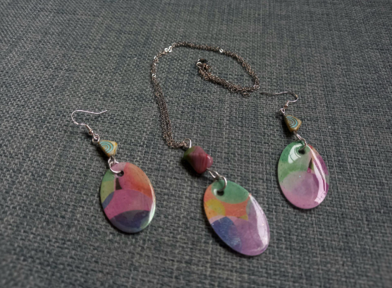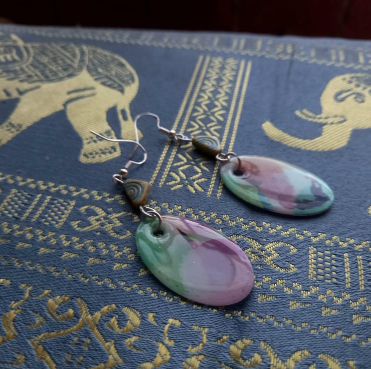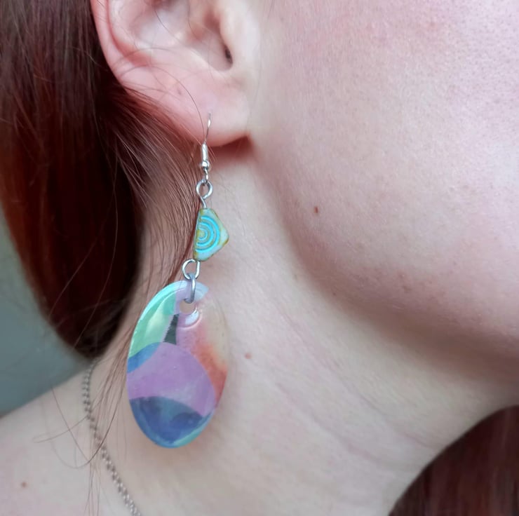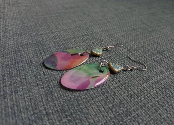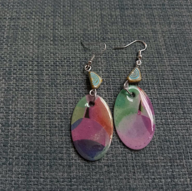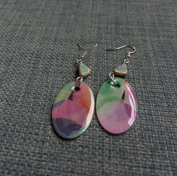 These earrings have been handmade with card and UV resin. The card is a multicoloured sea that has been cut into ovals. Then card is then coated in resin and is fastened to an abstract bead with stainless steel wire.