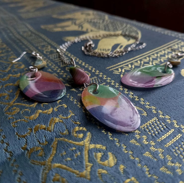 Another one of my "paper meets resin" creations. I just really loved the different colours in here and some of them were even embossed! I spent time finding the best parts of the paper and then added some iridescent purple mica to give it that added shine. Top it off with a pair of abstract beads and you have a perfectly lightweight pair of earrings that everyone will notice - and keep your eye out for the matching necklace, coming soon!