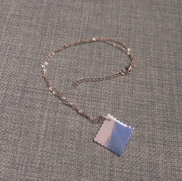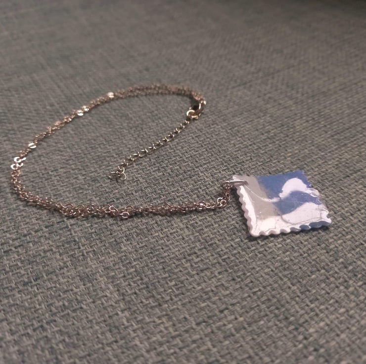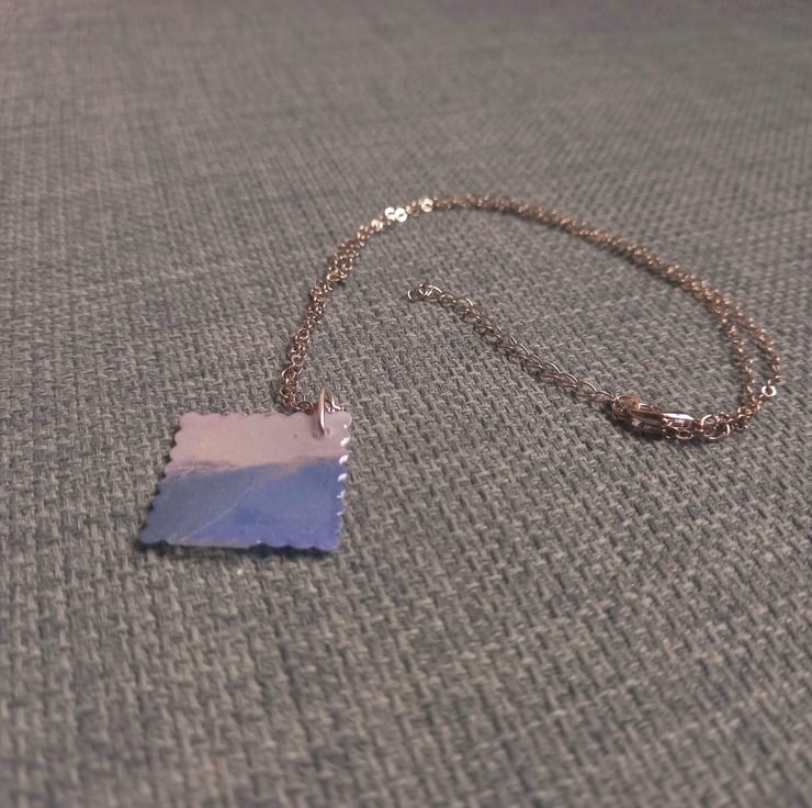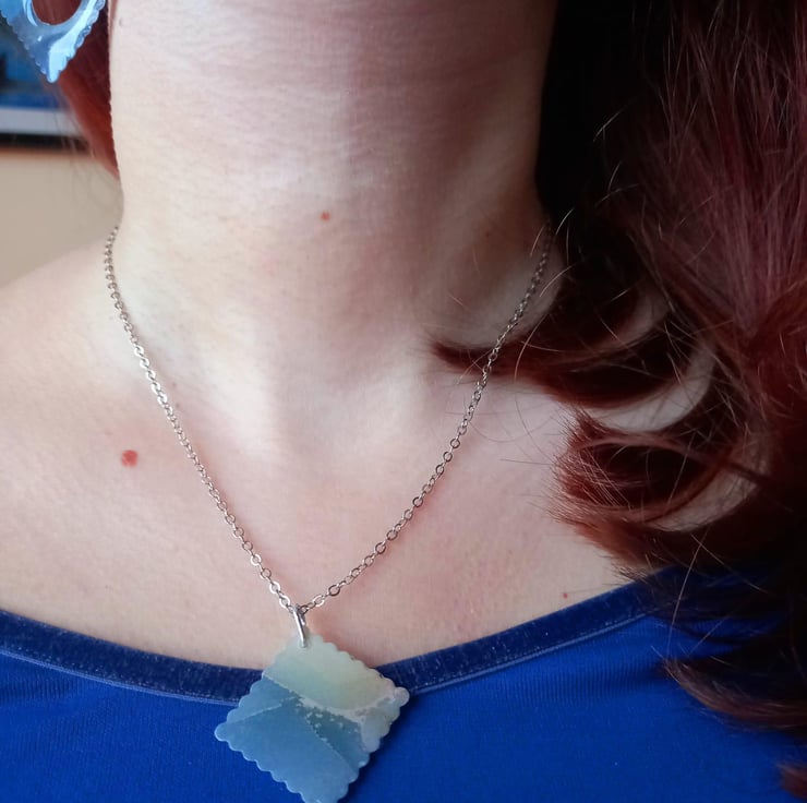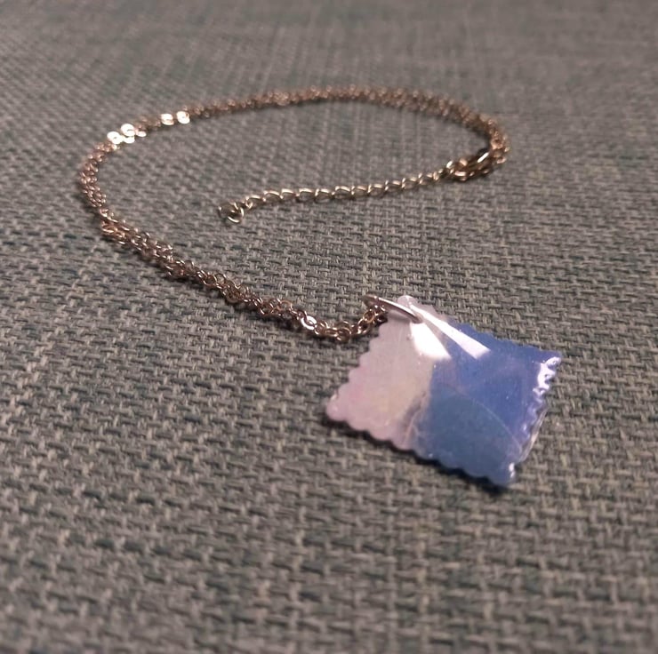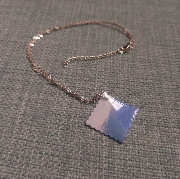 These necklaces are handmade with UV resin and card. The card is marbled blue and grey with a sprinkle of silver mica powder to add that extra shine. The card is then sealed with resin and is fastened together with a stainless steel wire.