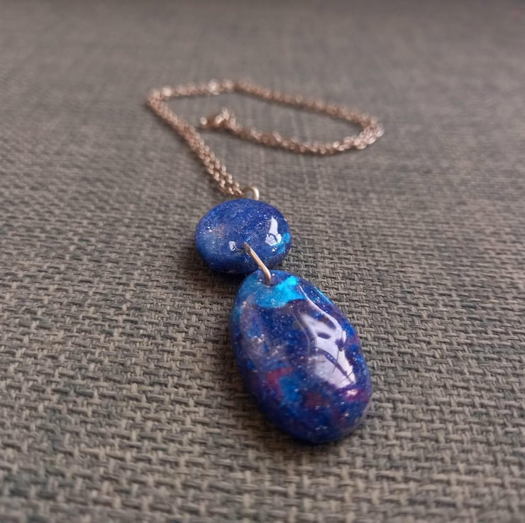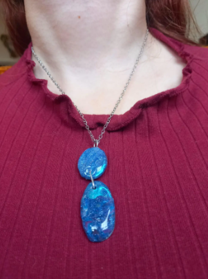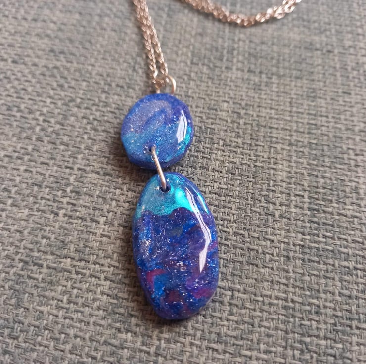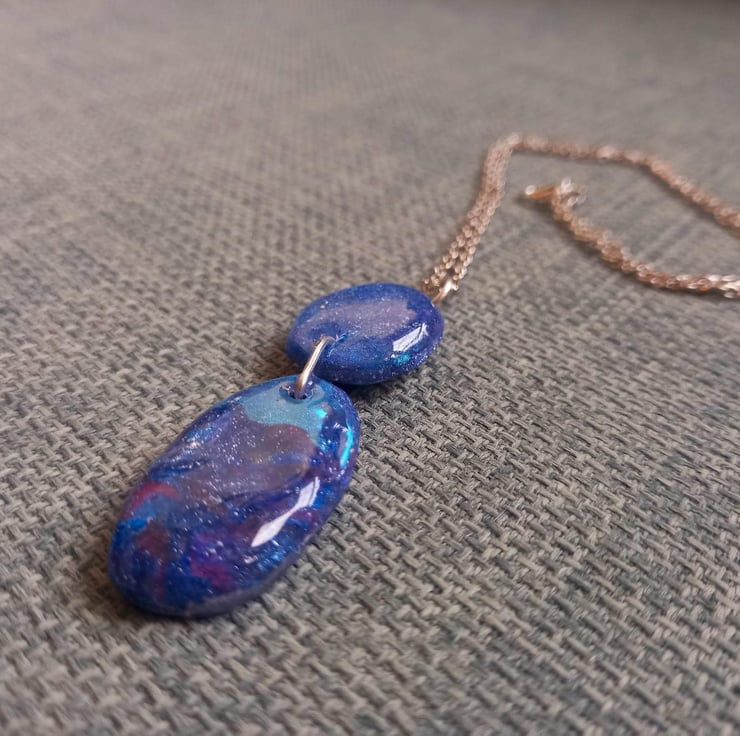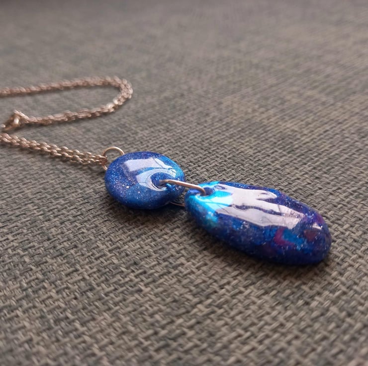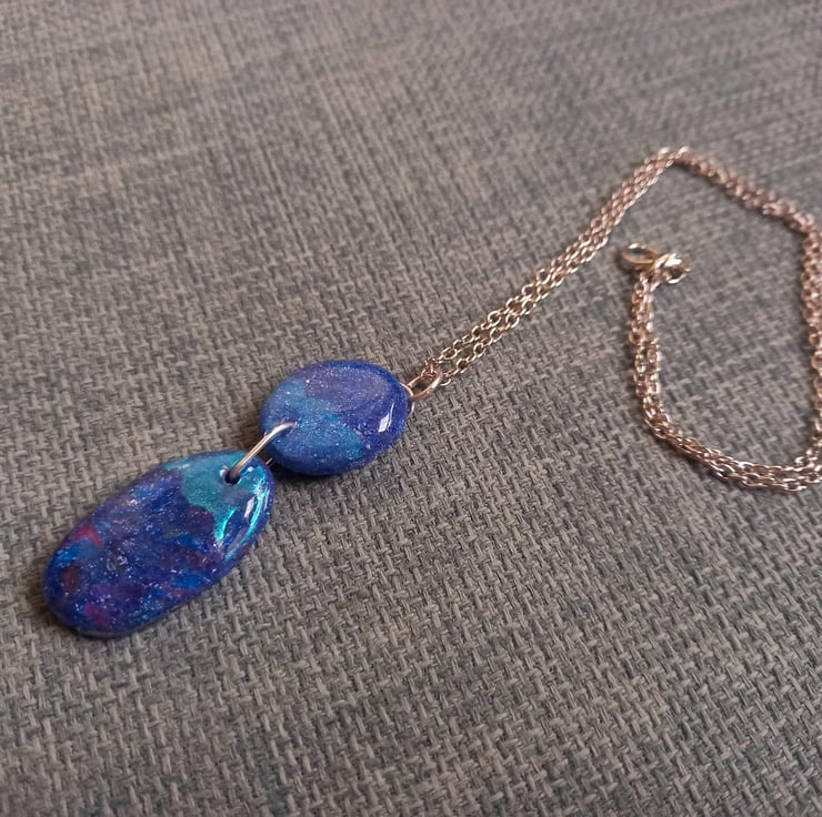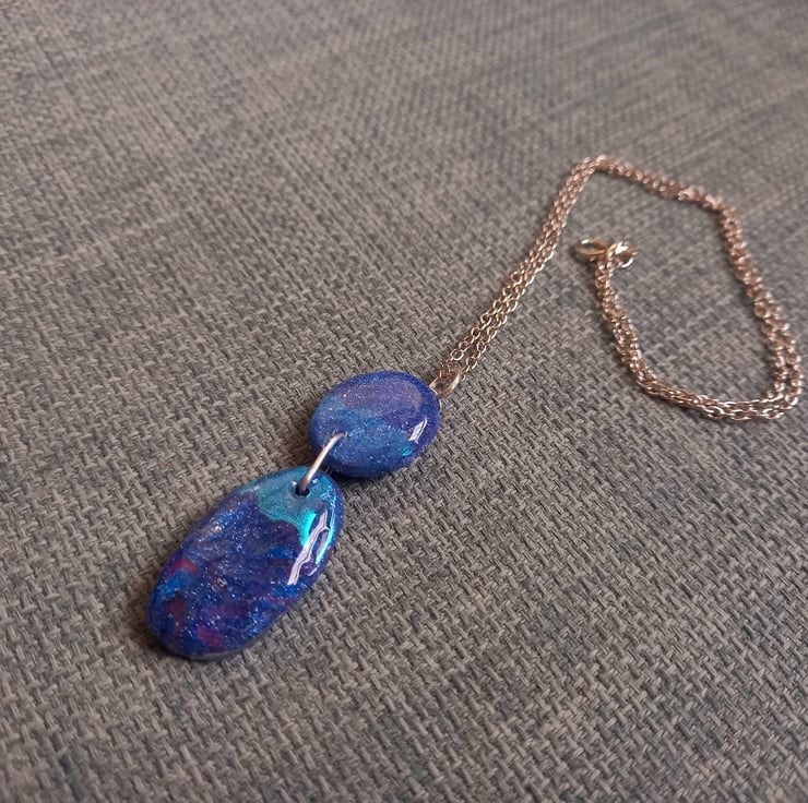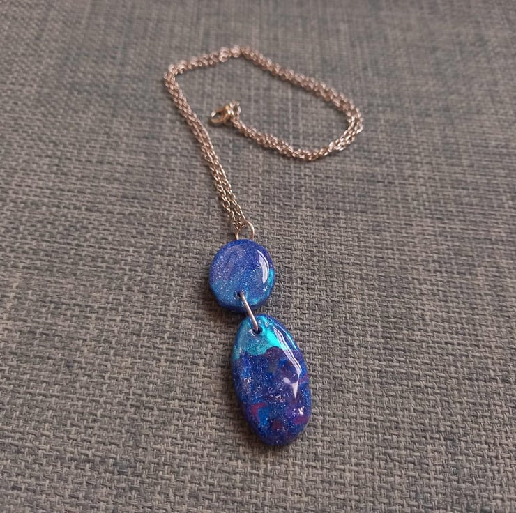 These necklaces have been handmade with polymer clay and UV resin. The colours are made with various blue, purple and silver mica powders, paint and alcohol inks that have been marbled together and cut with cutters. Lastly they are coated in resin and attached to a stainless steel wire.