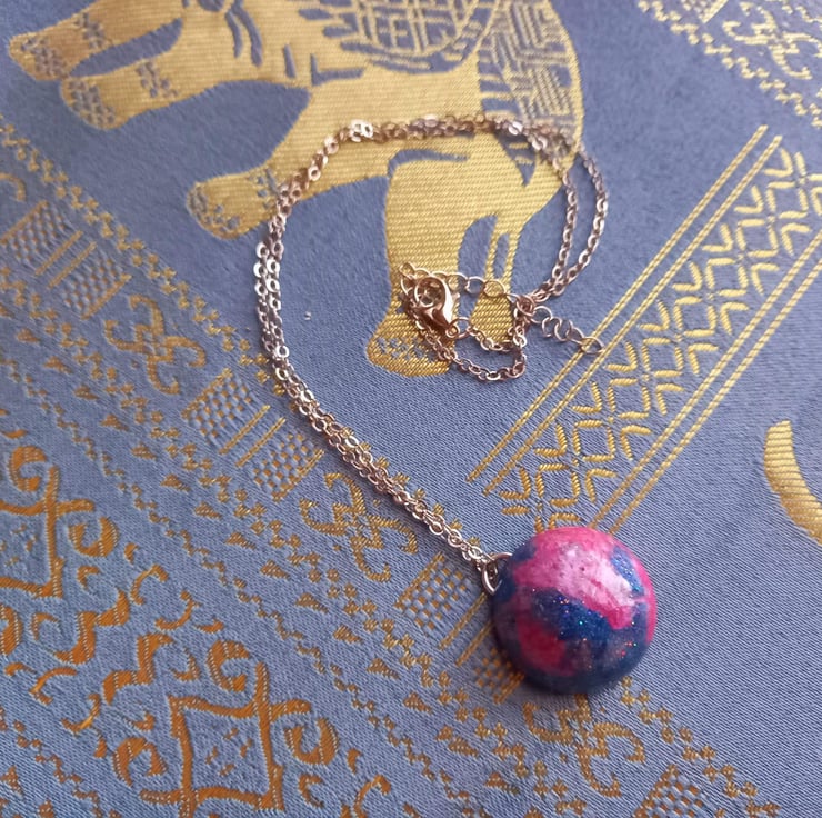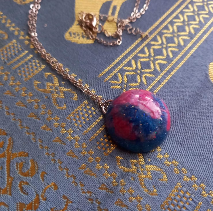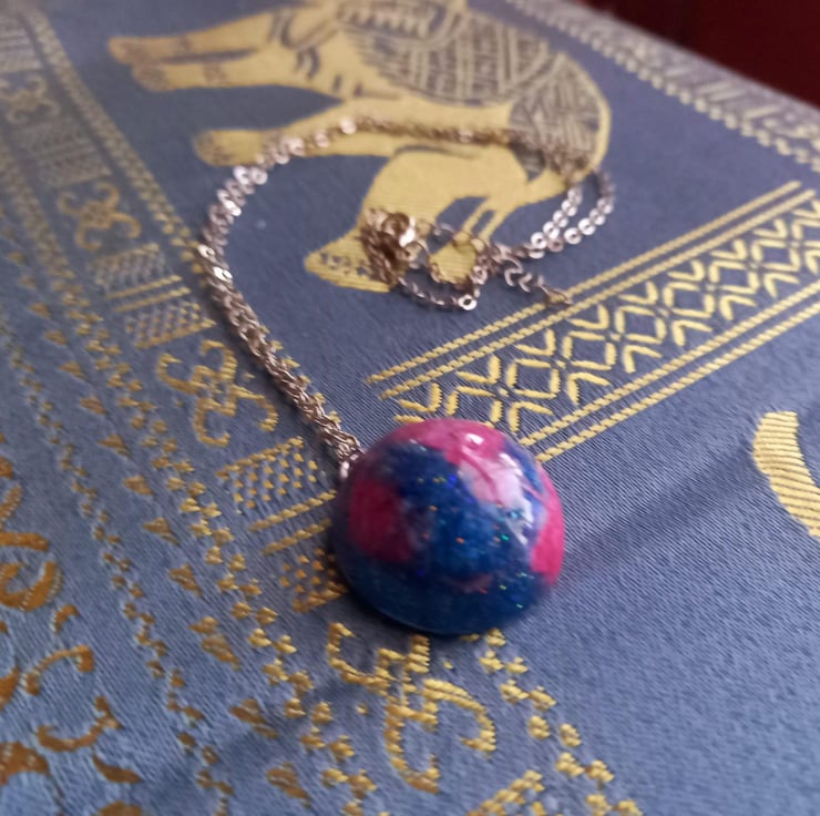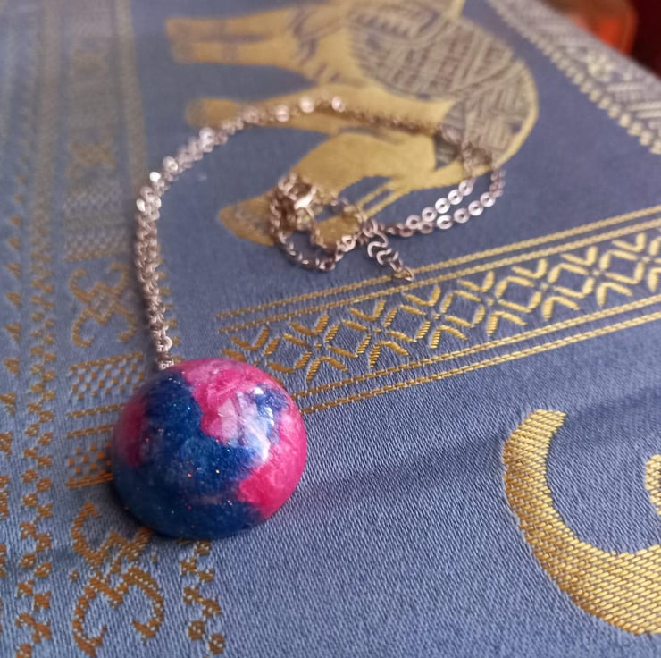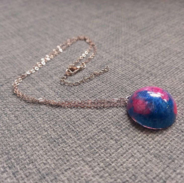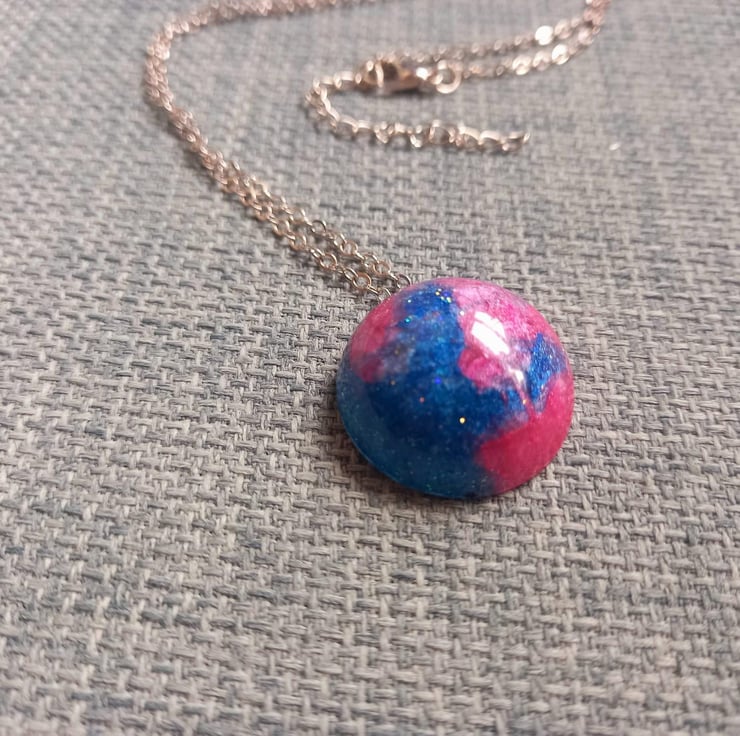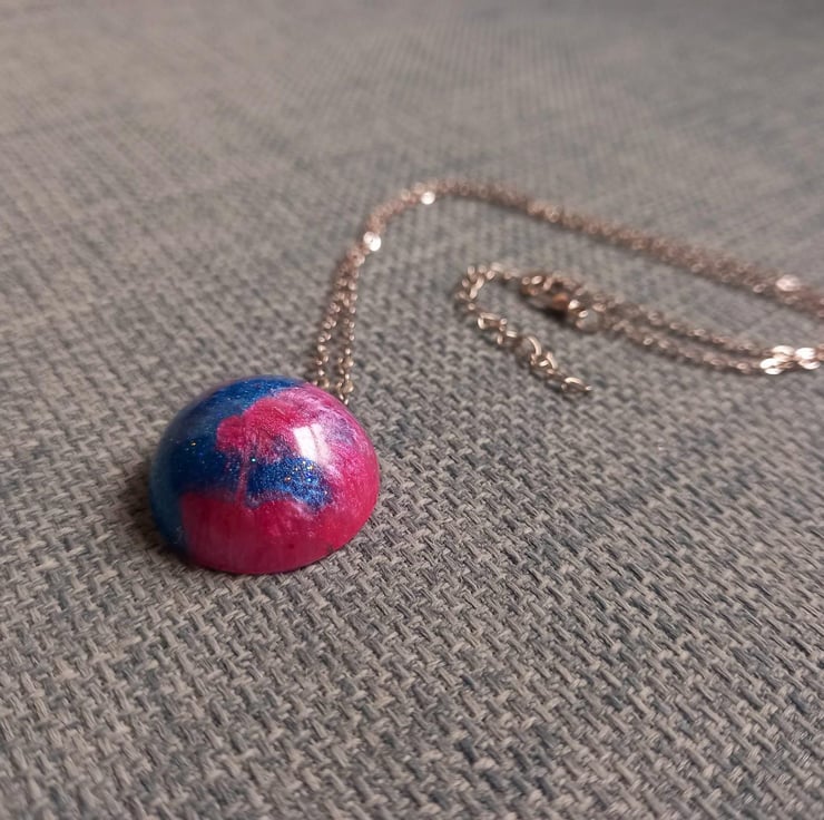 These necklaces have been handmade with epoxy resin and moulds. The colours are a variation of blue and pink mica powders and alcohol inks. They hang from a stainless steel wire and chain.