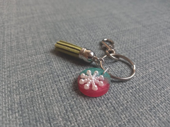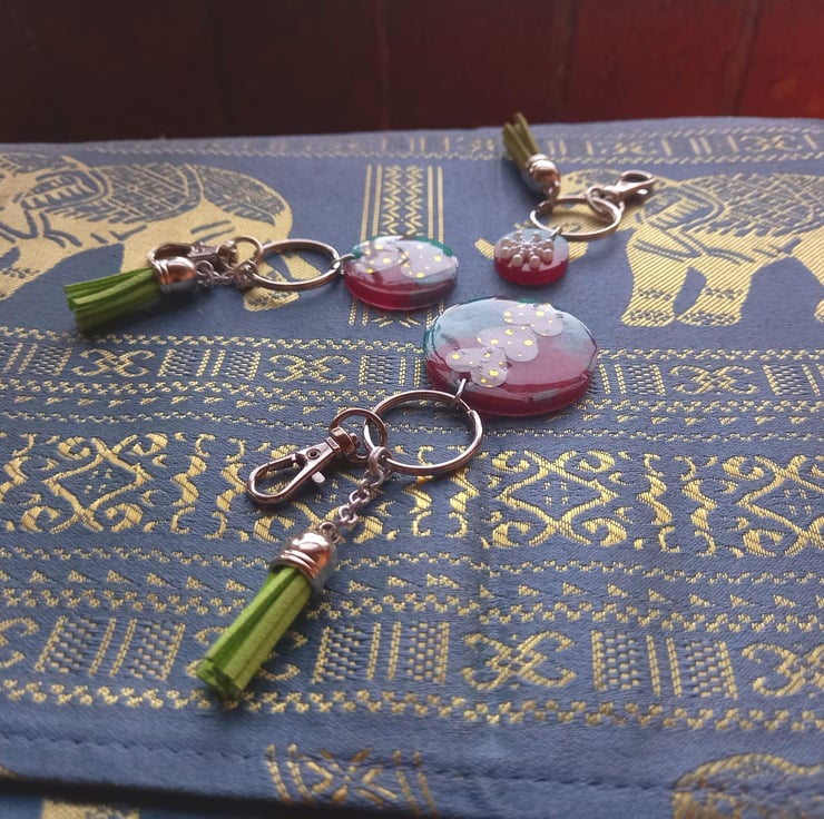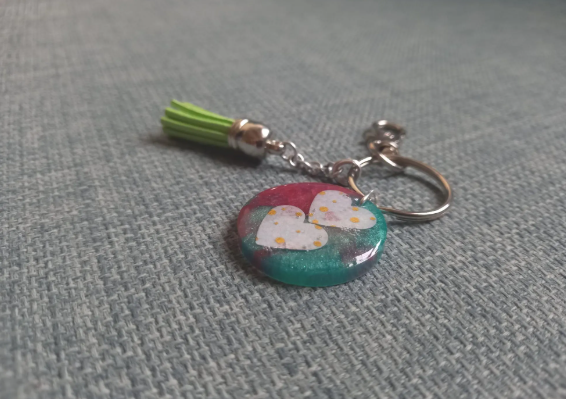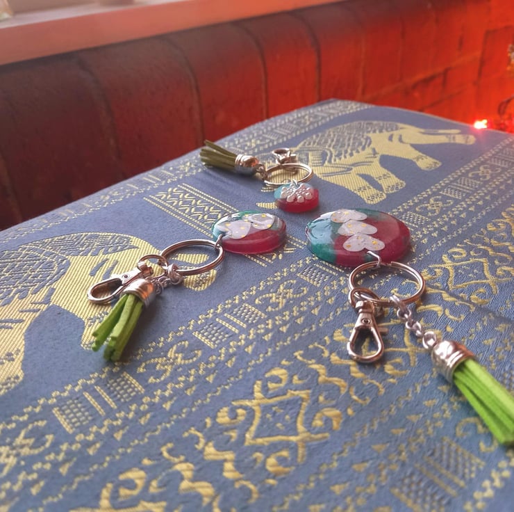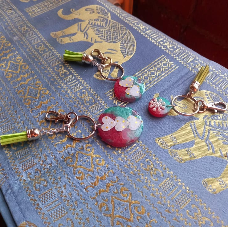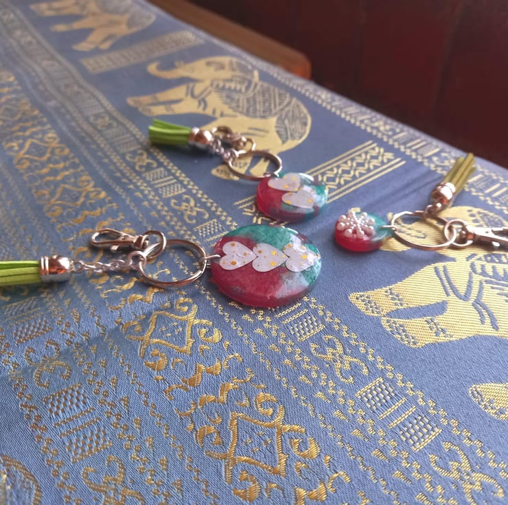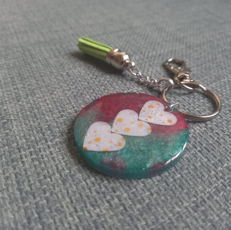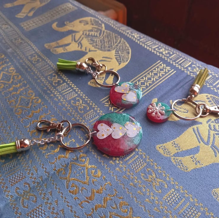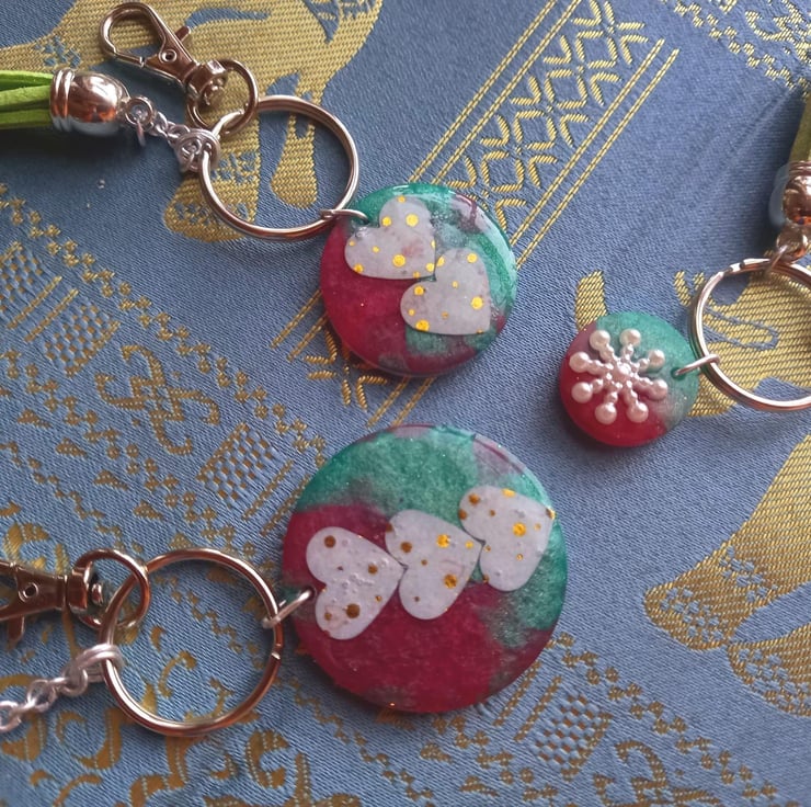 These keyrings are handmade with epoxy resin and moulds. The resin has been mixed with a combination of red and green alcohol inks and mica powders to create the effect. Then some paper hearts and plastic snowflakes are stuck on the front with some UV resin.