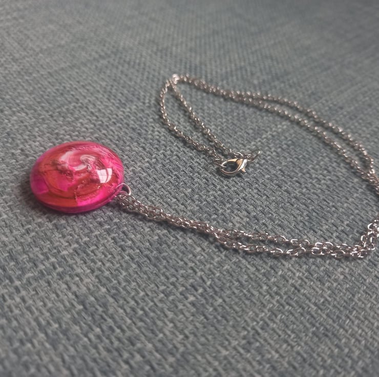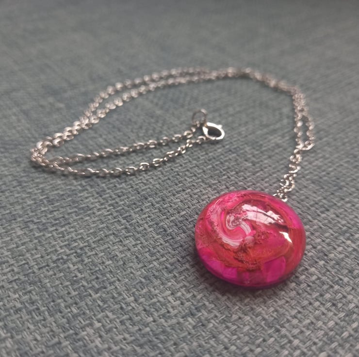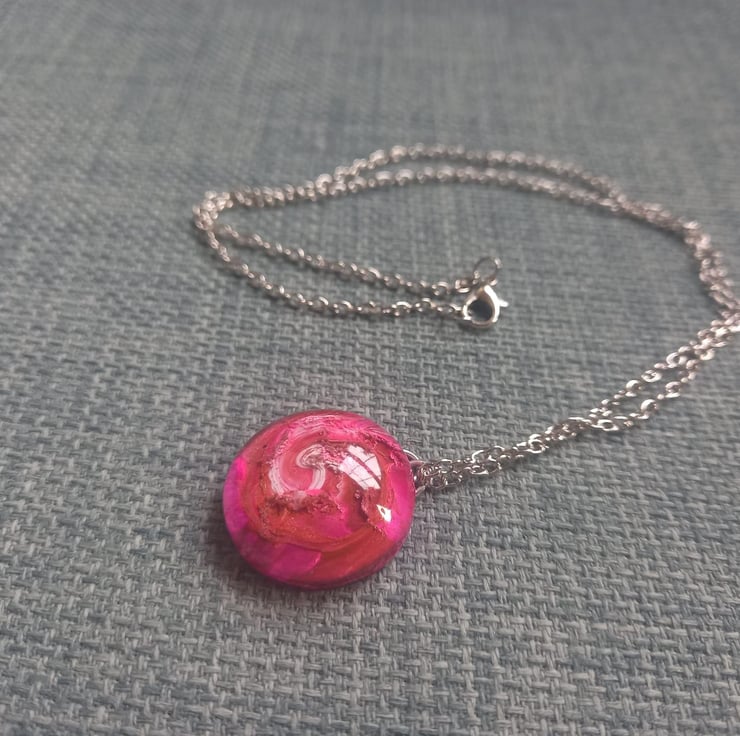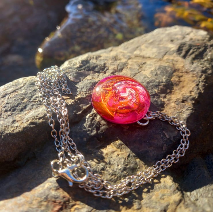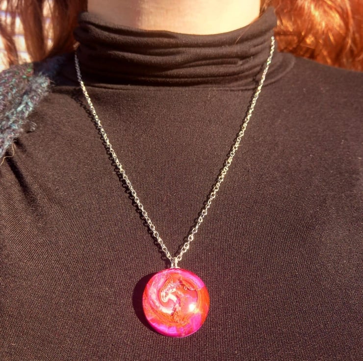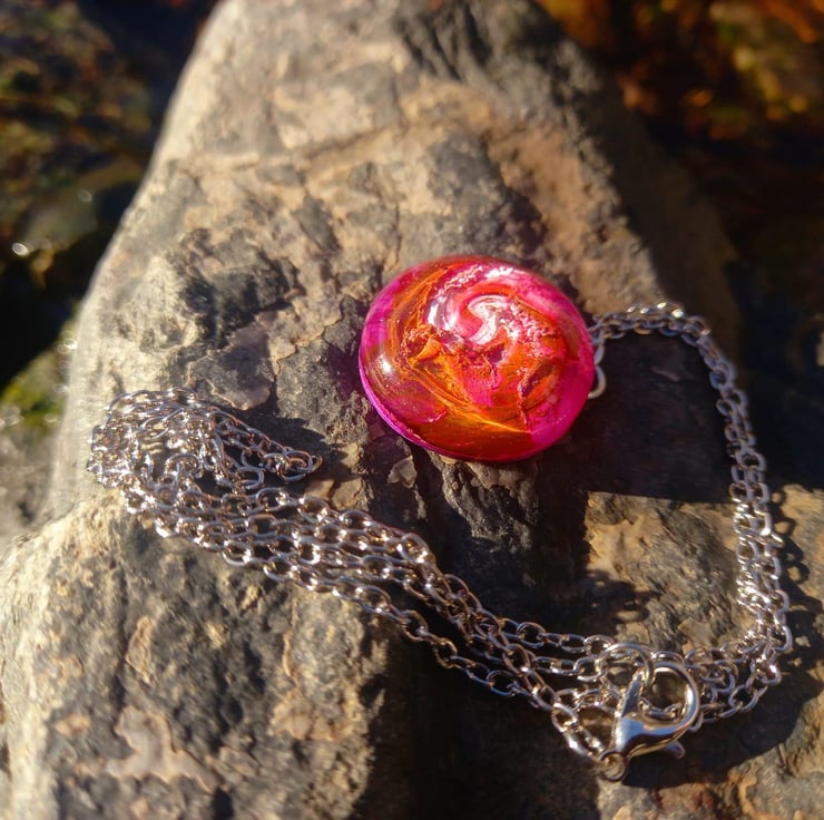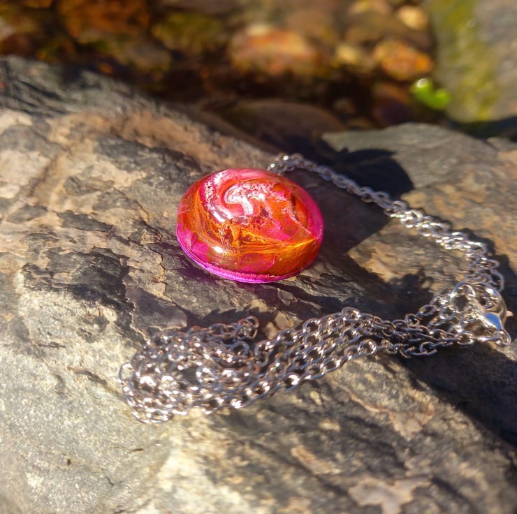 These necklaces have been handmade with epoxy resin and moulds. The sea of colours are created with white, violet, peach and copper alcohol inks. They hang from a stainless steel wire and chain