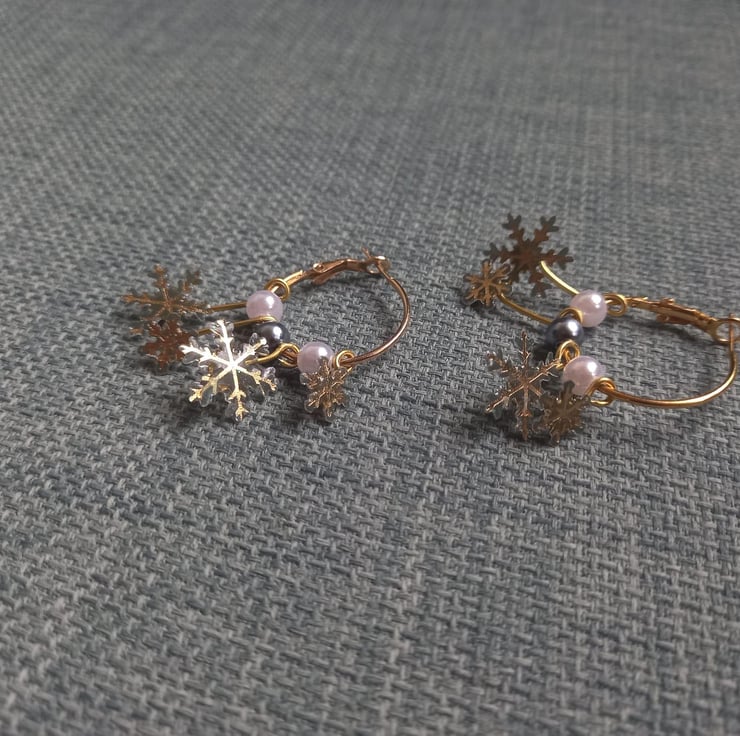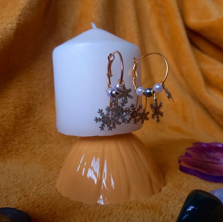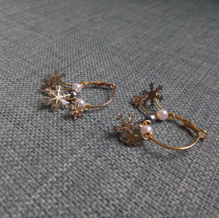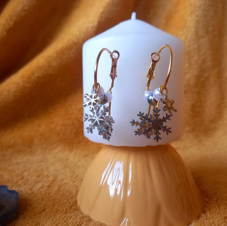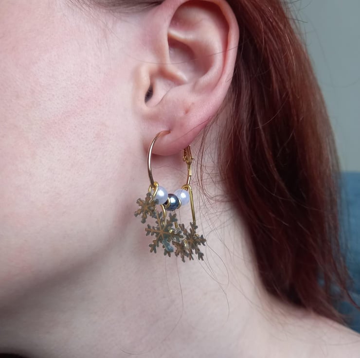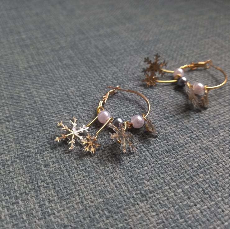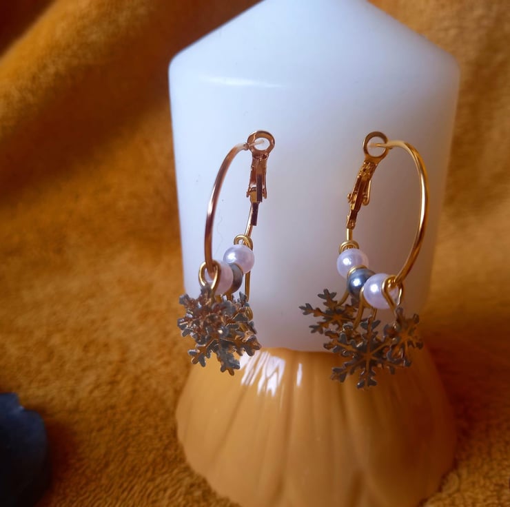 These earrings have been handmade with UV resin and card. The card has been cut so that only the gold snowflake remains. There are two small and two larger snowflakes that dangle from a copper hoop at different lengths. Between the snowflakes are different coloured beads.