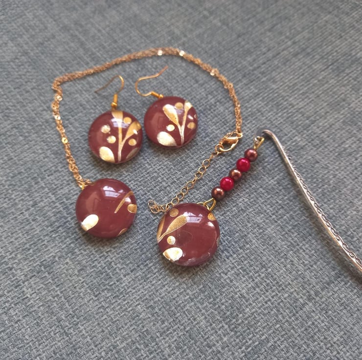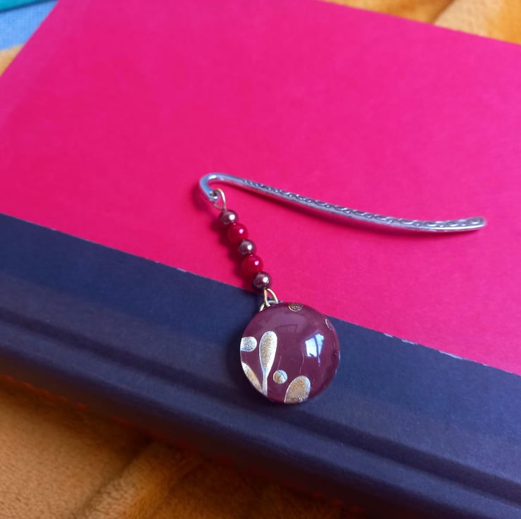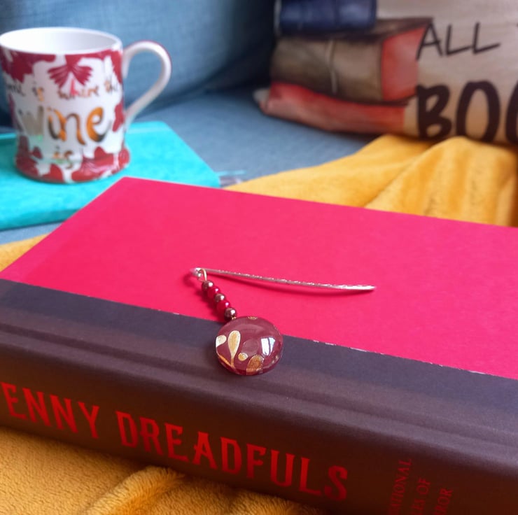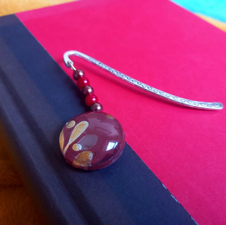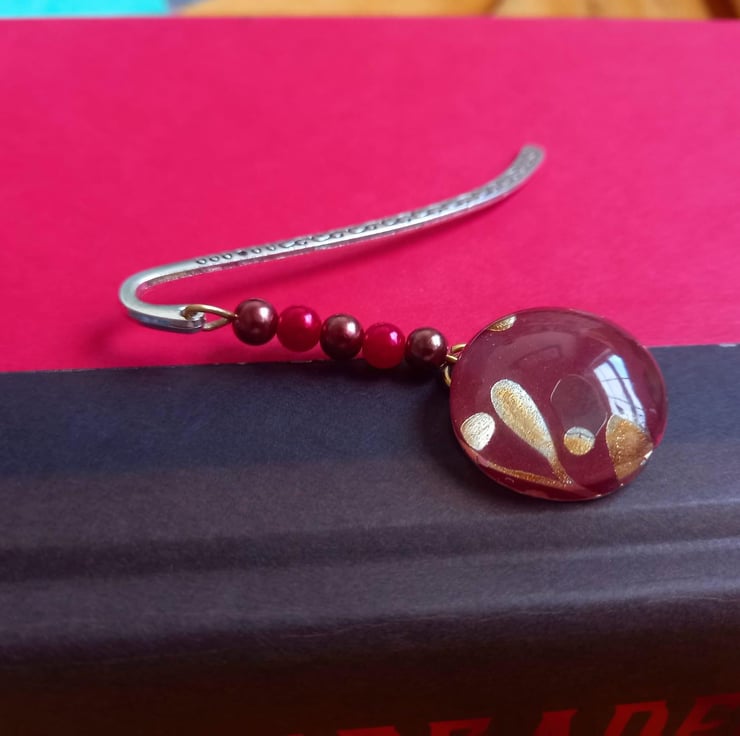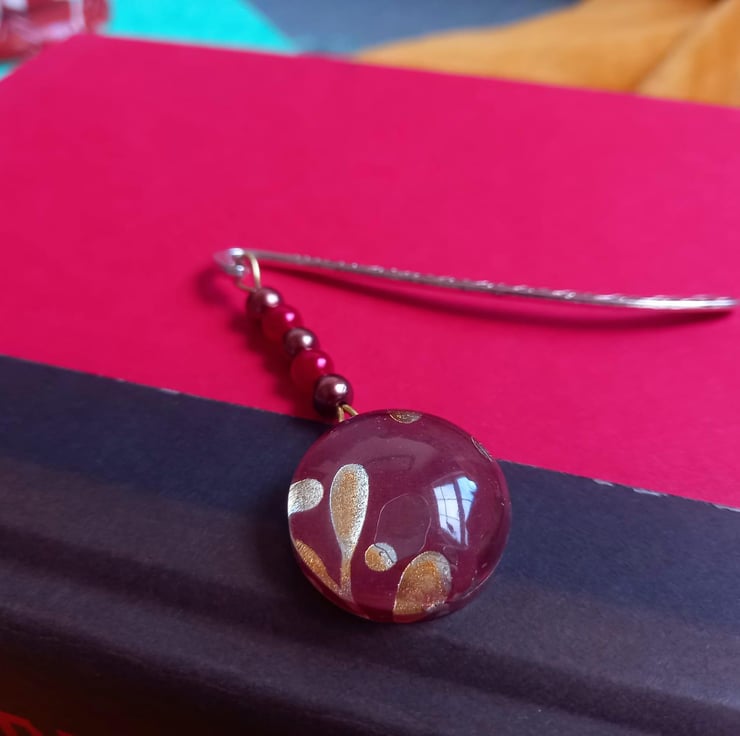 These bookmarks are made from card and UV resin. The card is of an autumnal nature and are dark red with gold leaf swirls. The card is then domed with resin before attaching a copper wire with beads and stainless steel book hanger.