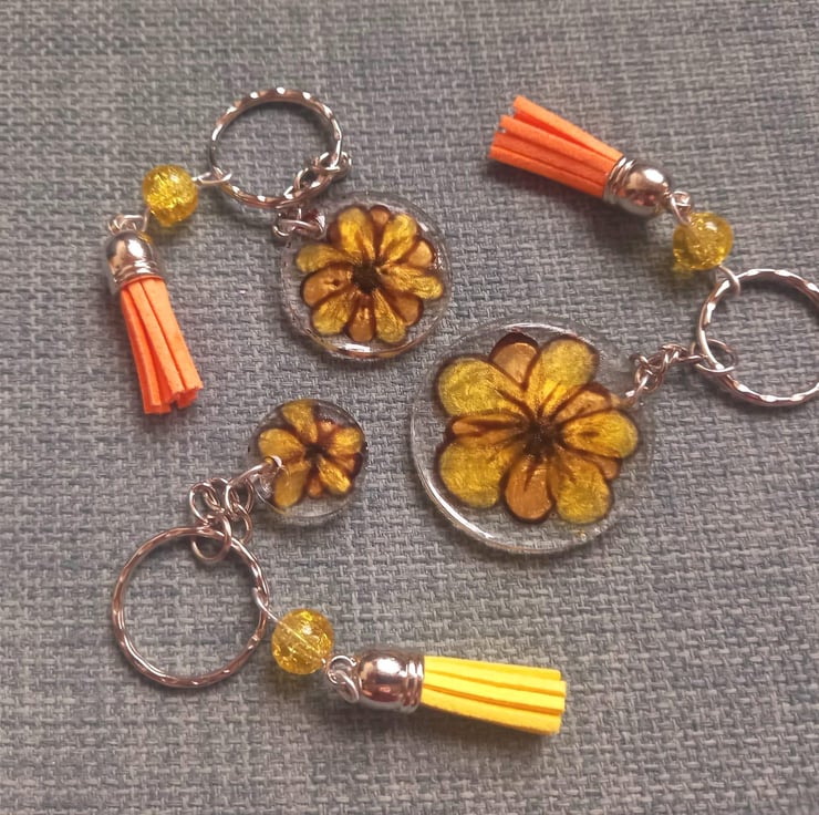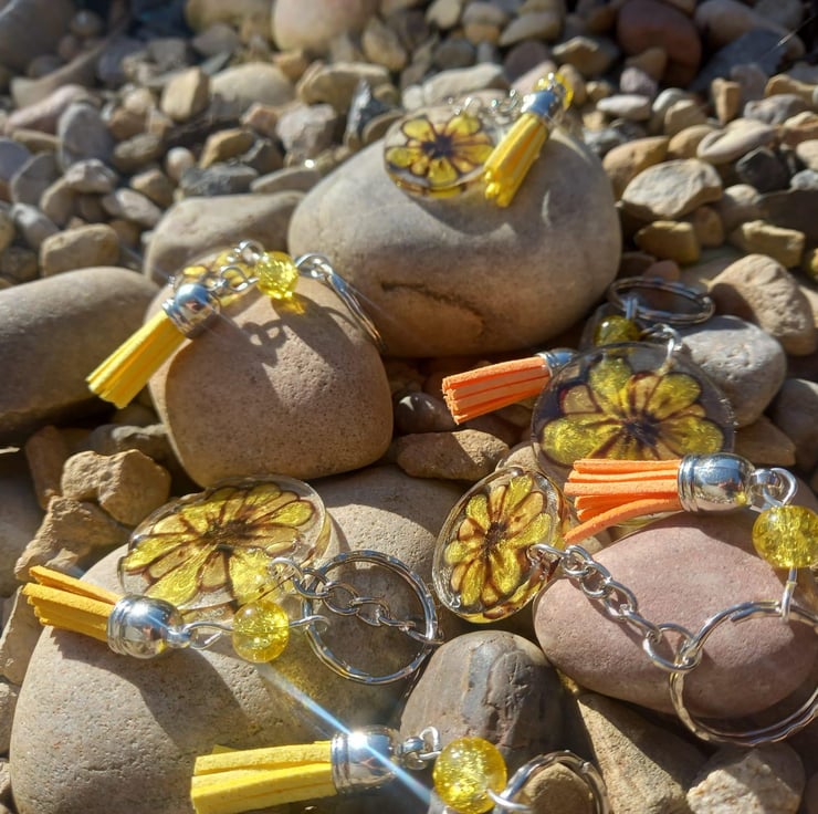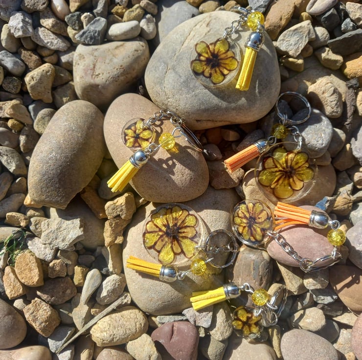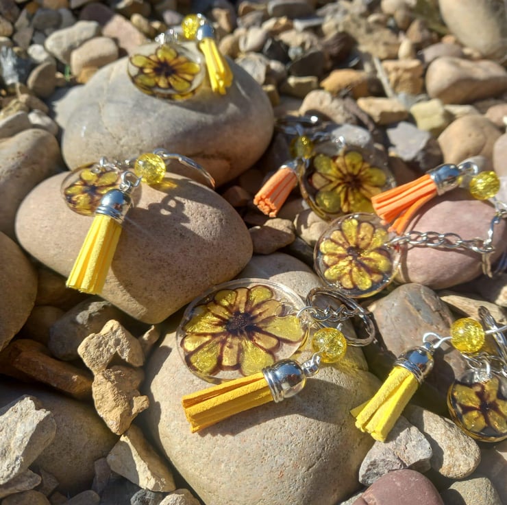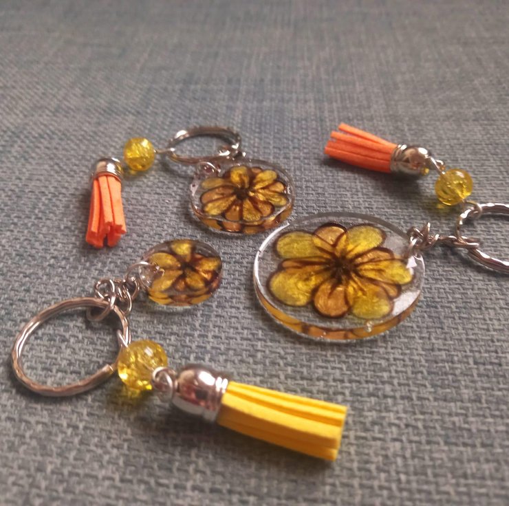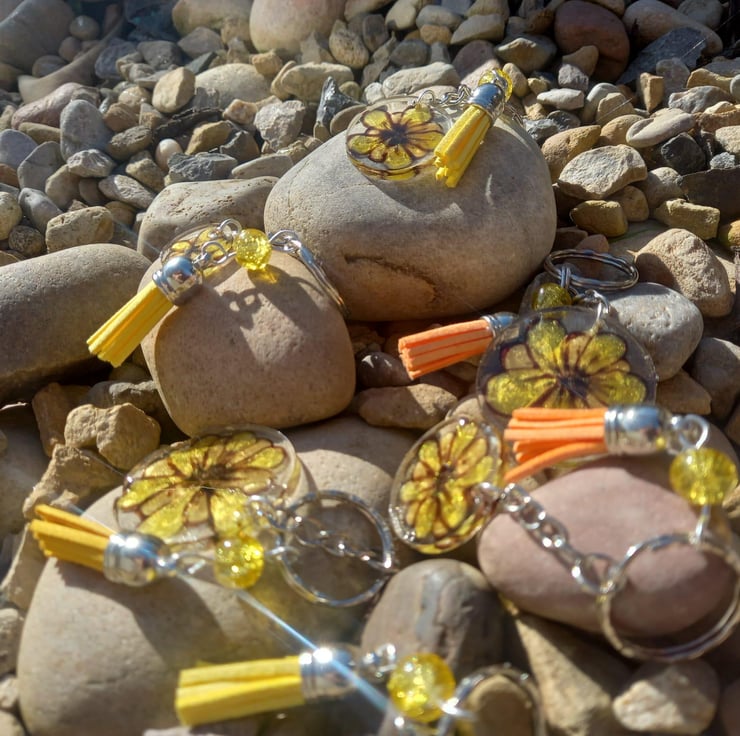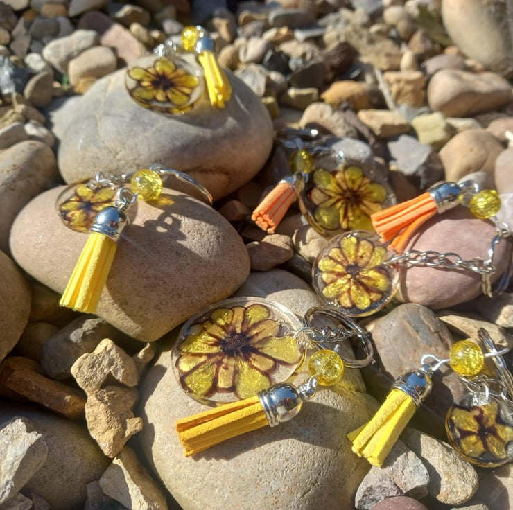 These keyrings were made using UV resin. To create the sunflower, it was hand painted using resin and yellow or coffee mica powder into a mould. They are then attached to a premade keyring with a tassle and a bead.