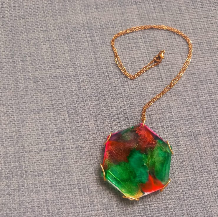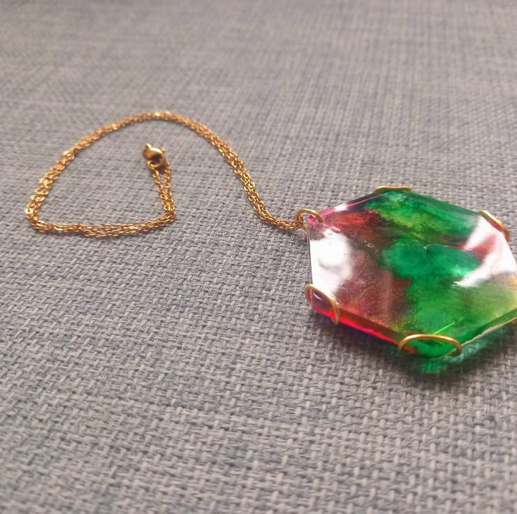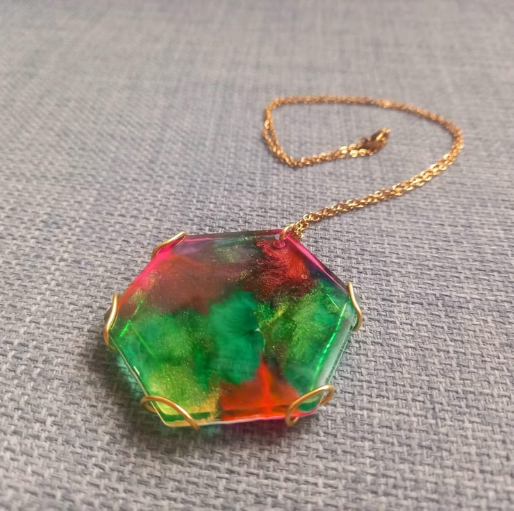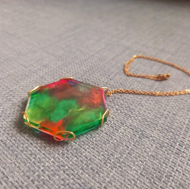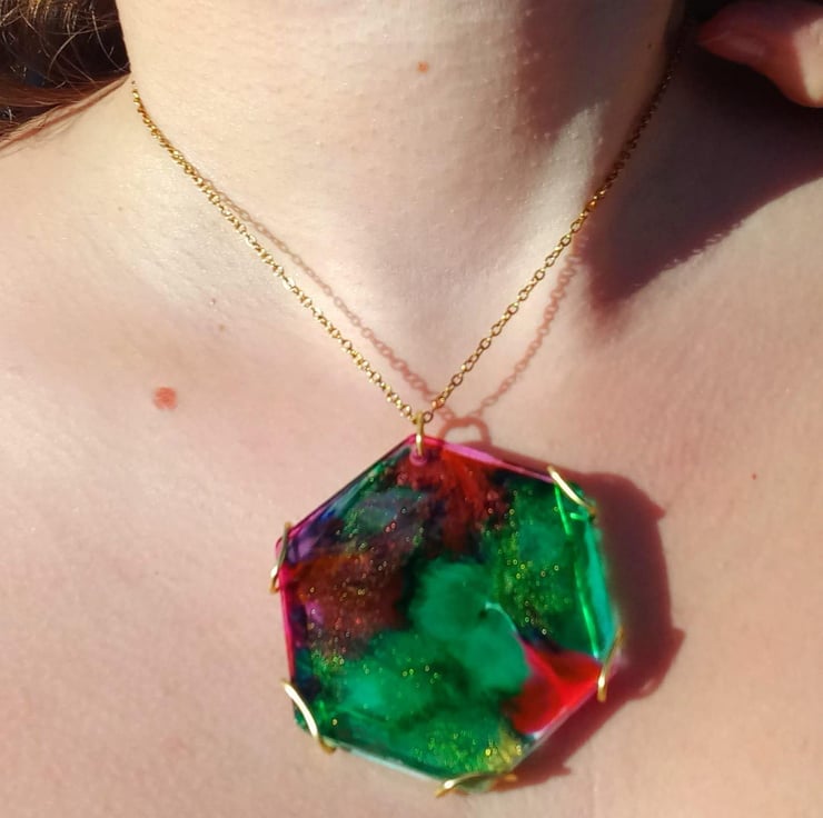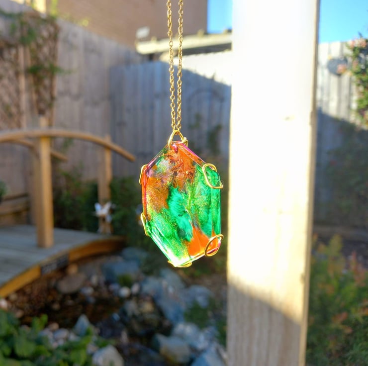 These necklaces are made with epxoy resin and a mould. To achieve the dream-like colours bright green, peach and gold alcohol ink are used. They are then wrapped in a copper wire and chain.