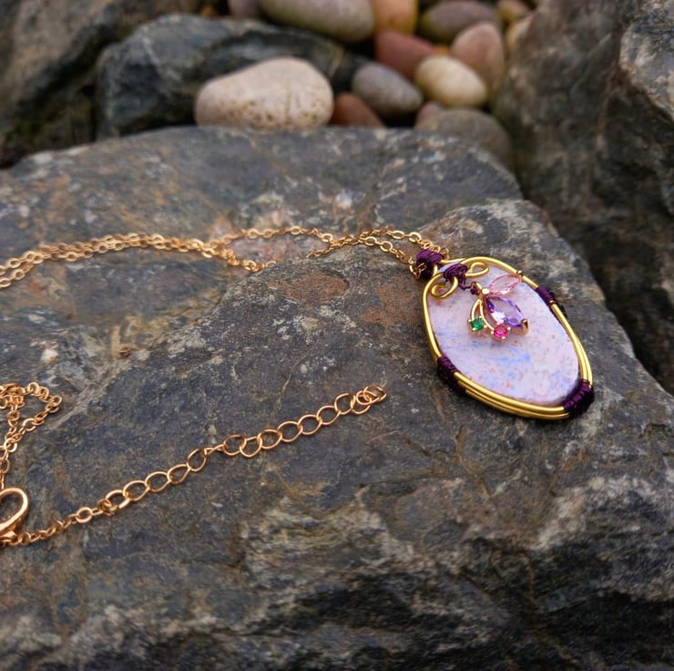 These necklaces have been made using igloo white polymer clay and UV resin. The clay was from a few previous projects that have been marbled together with dark blue alcohol ink and gold leaf. They are attached to a purple charm with copper with and purple fishing wire.