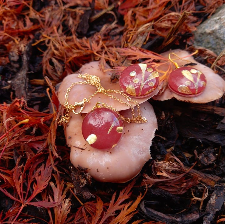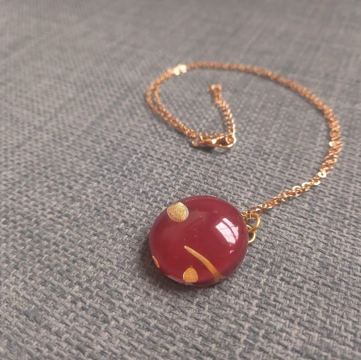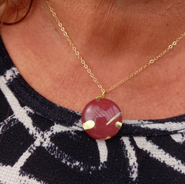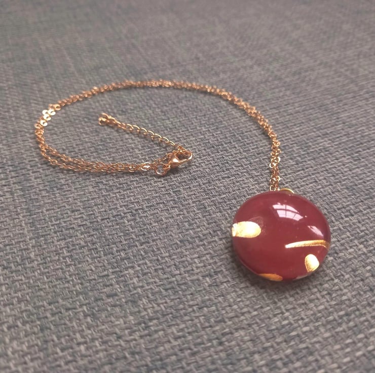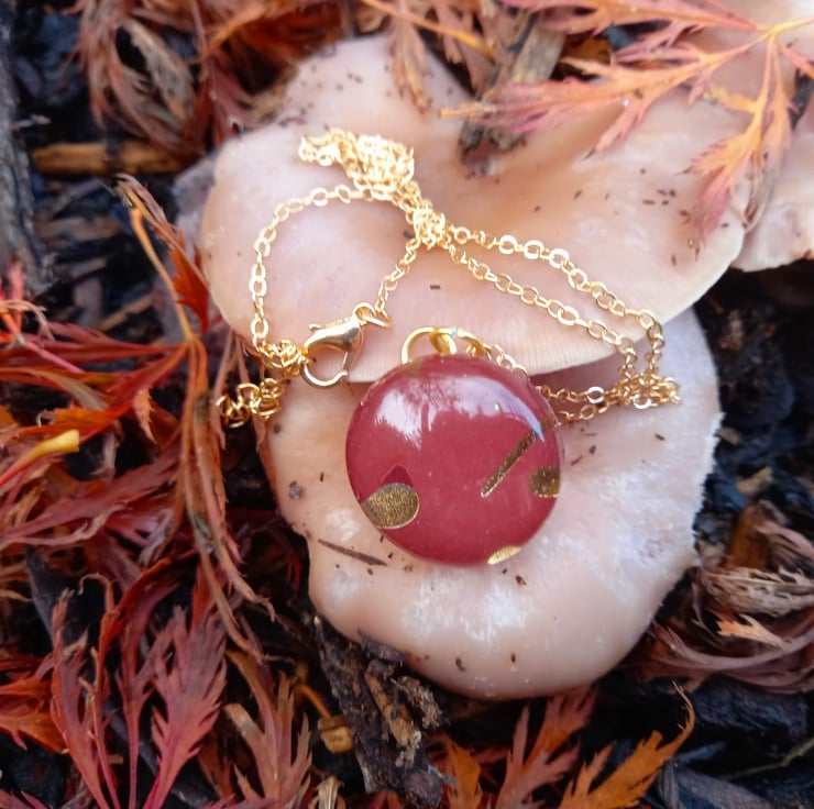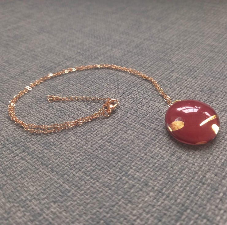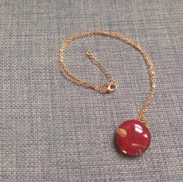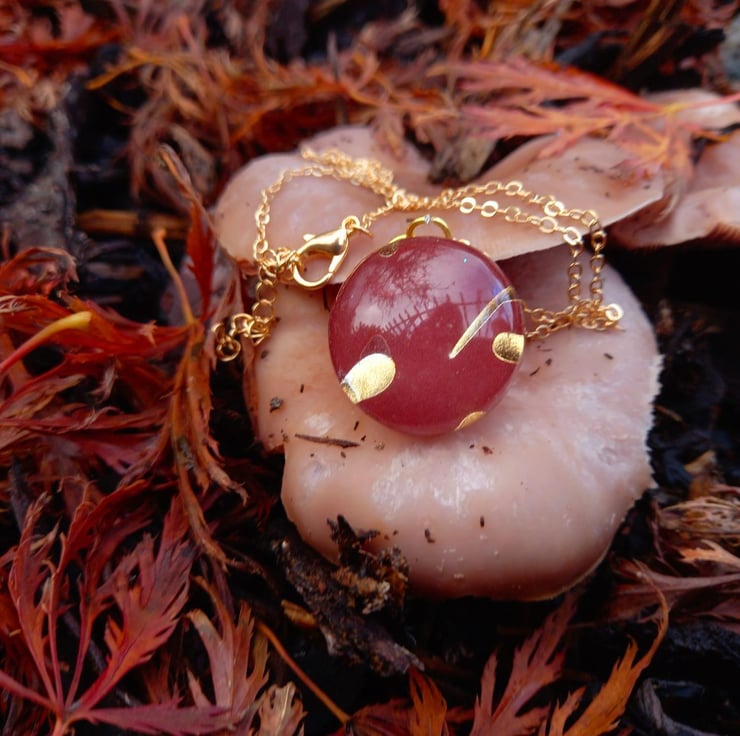 These necklaces are made from card and UV resin. The card is of an autumnal nature and are dark red with gold leaf swirls. The card is then domed with resin before attaching a copper wire and chain.