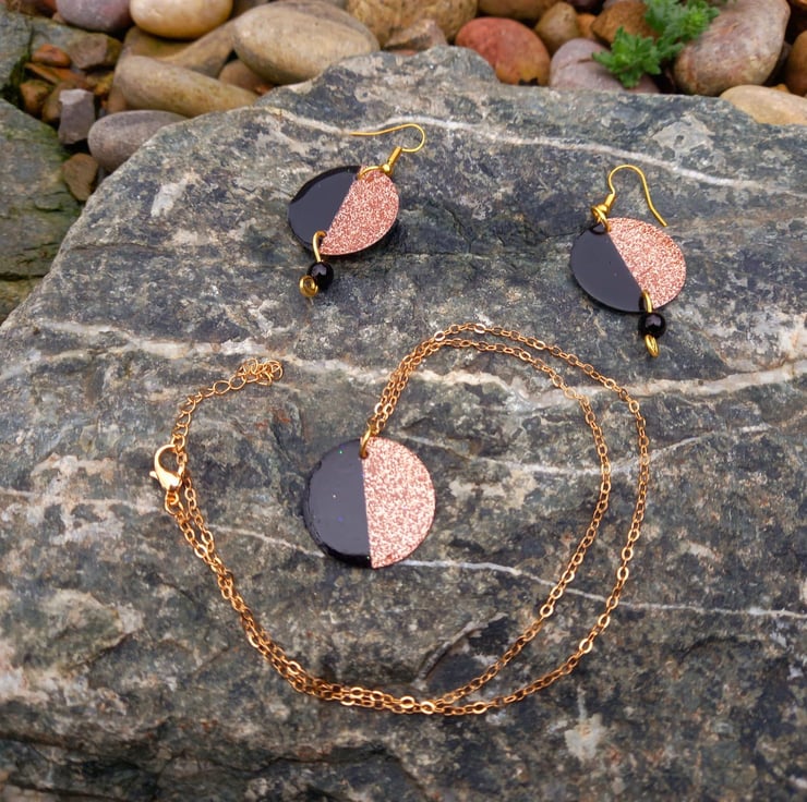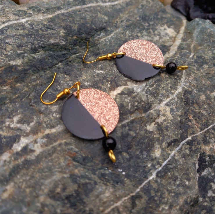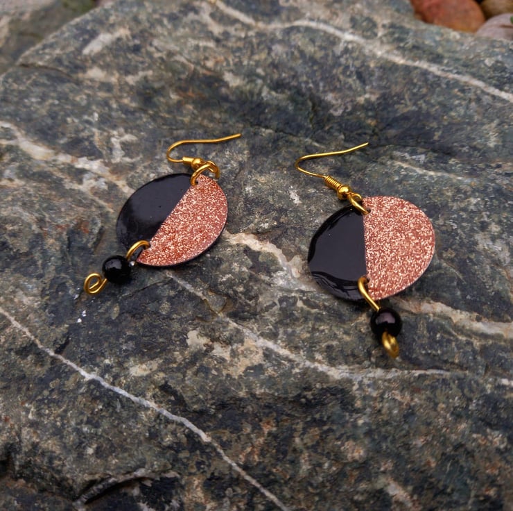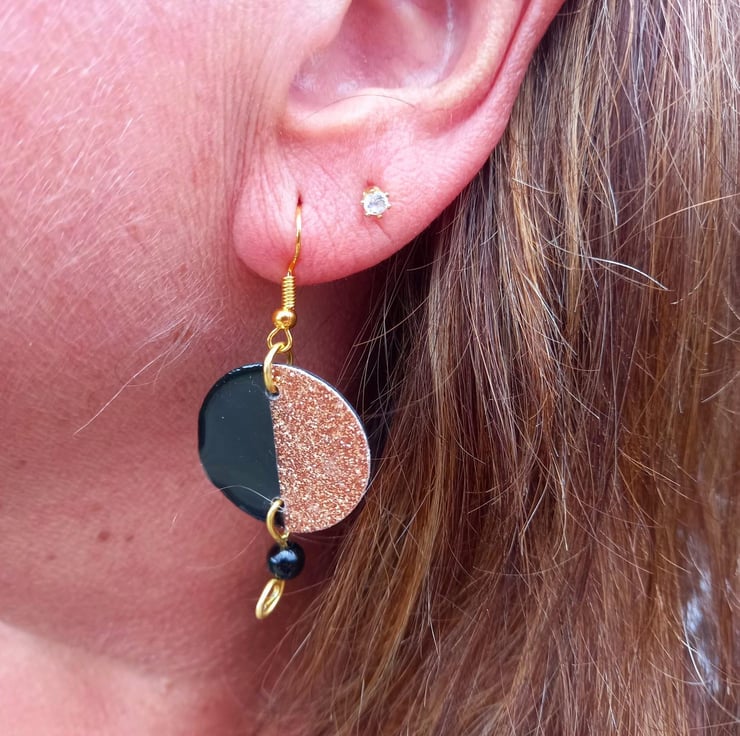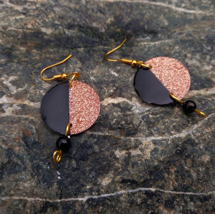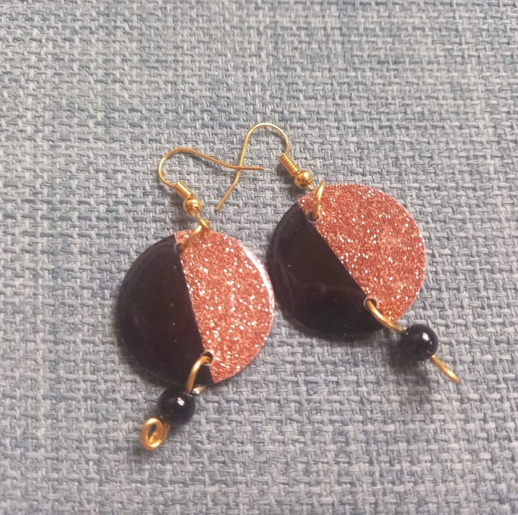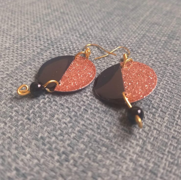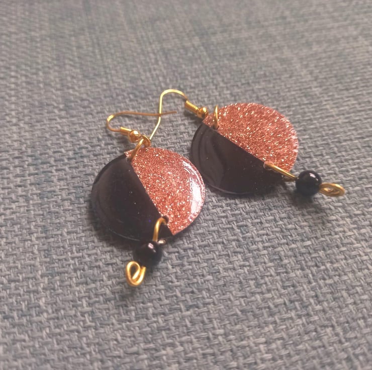 A beautiful pair of black and gold glittery circle dangle earrings with a black bead on a copper wire. As these earrings have been made with resin, colours and patterns may vary.