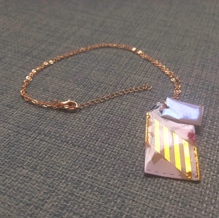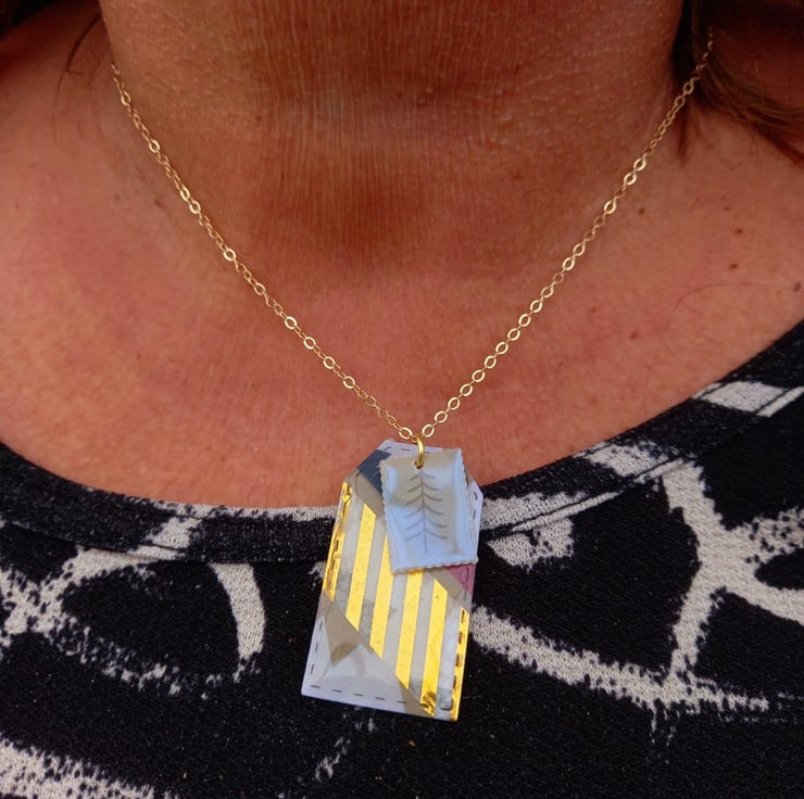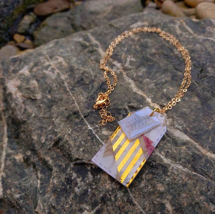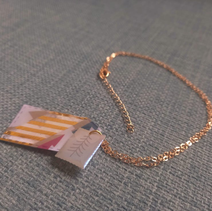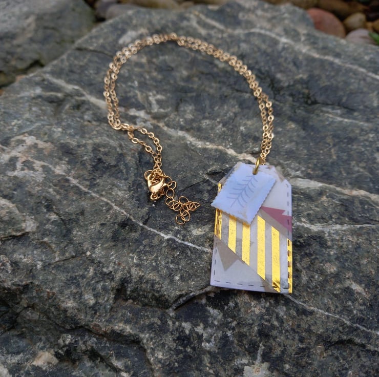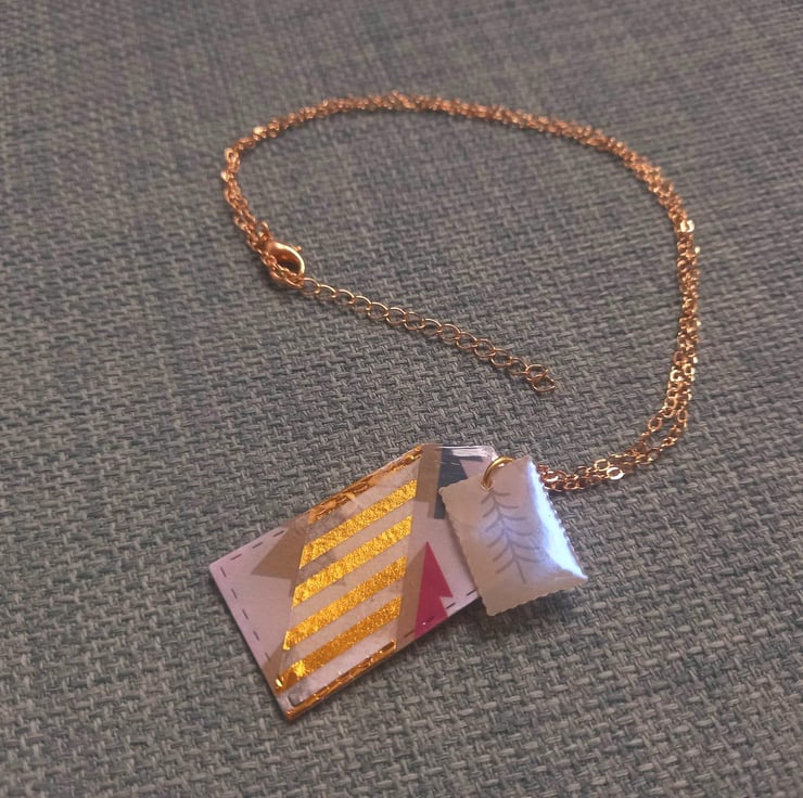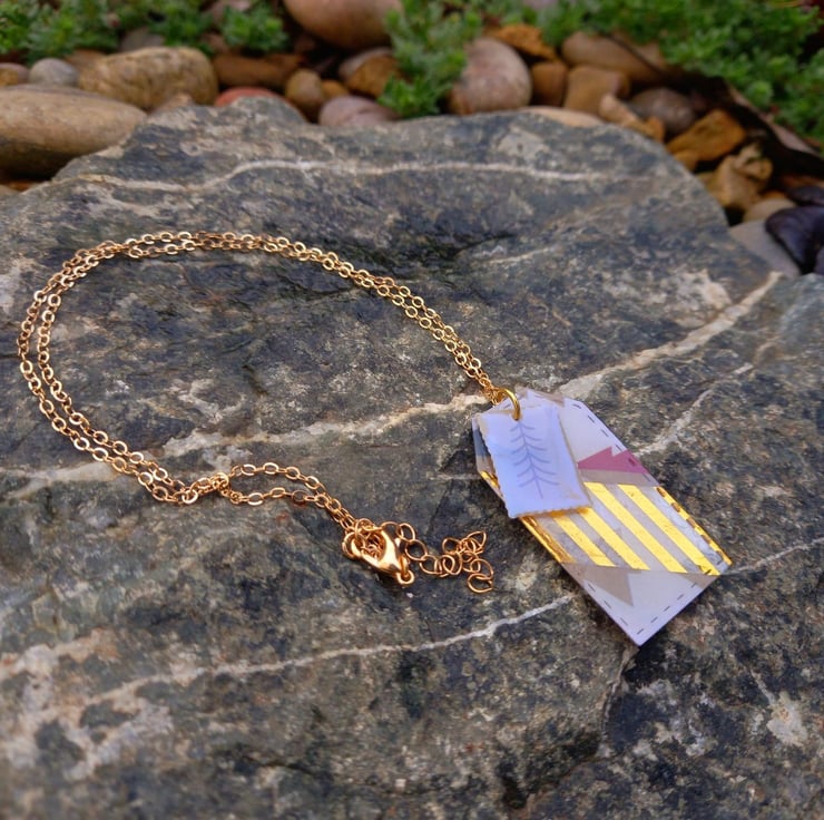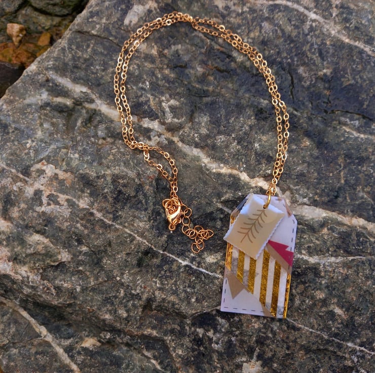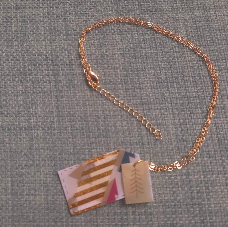 These necklaces have been made with Christmas card and UV resin. The card has then been cut into tag and stamp shapes after adding some washi tape. They are fastened together on a copper wire and chain.