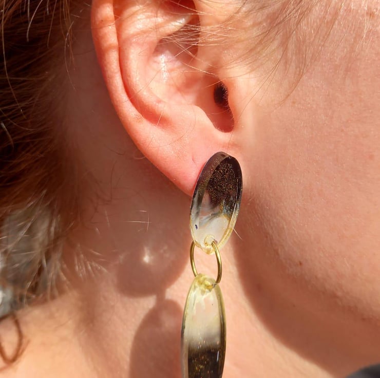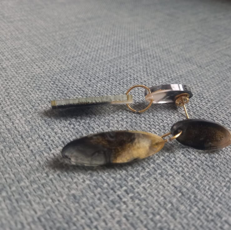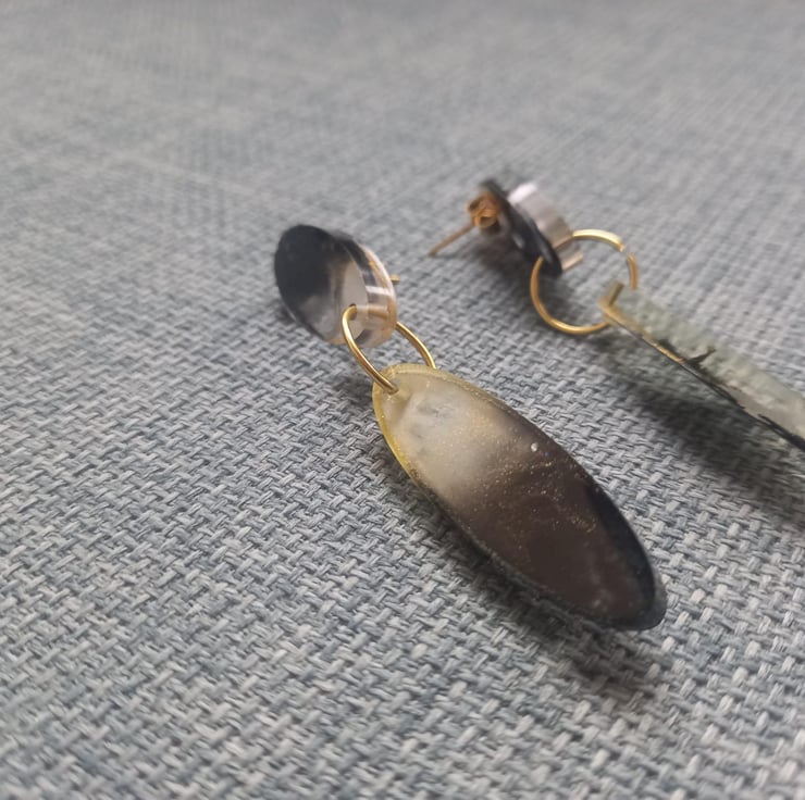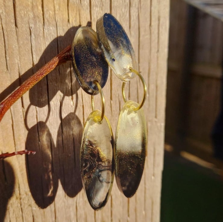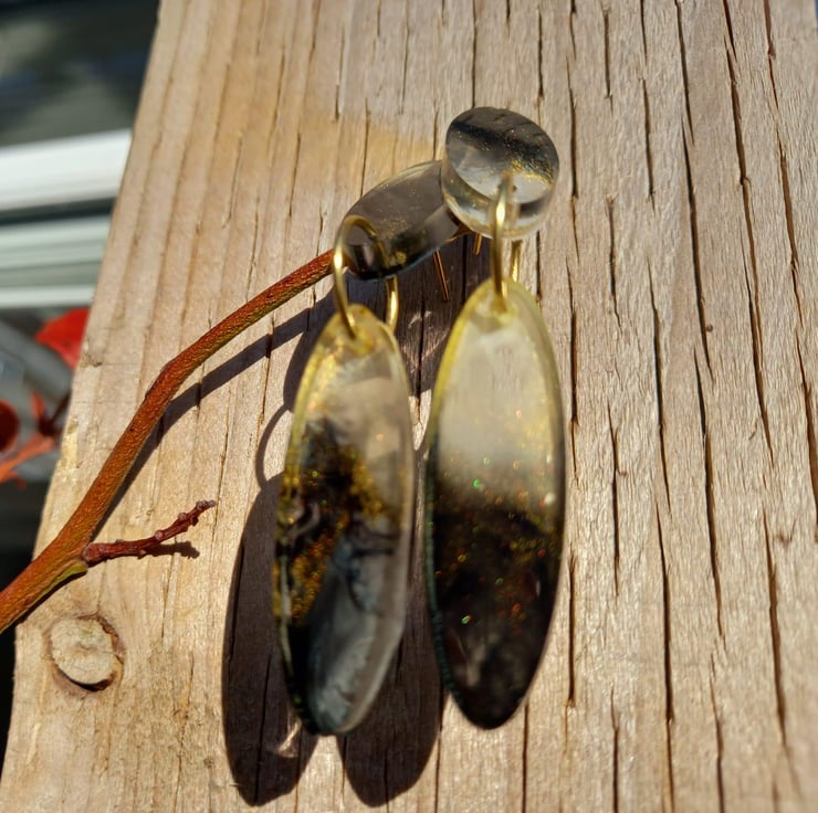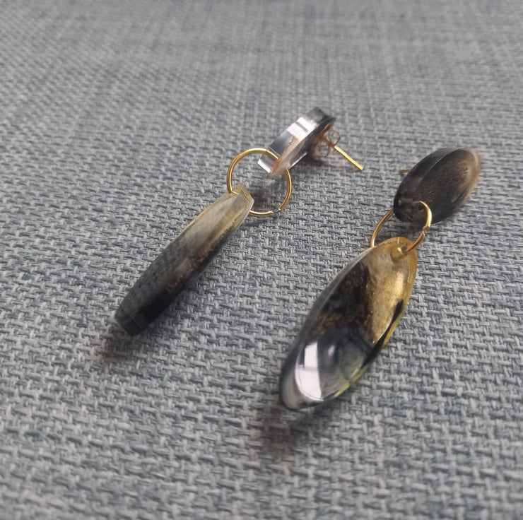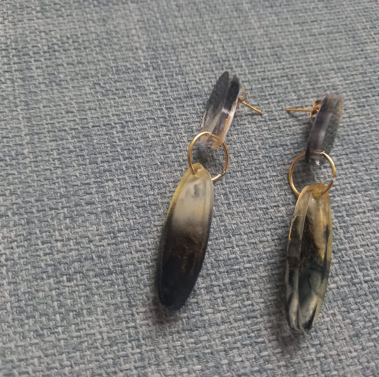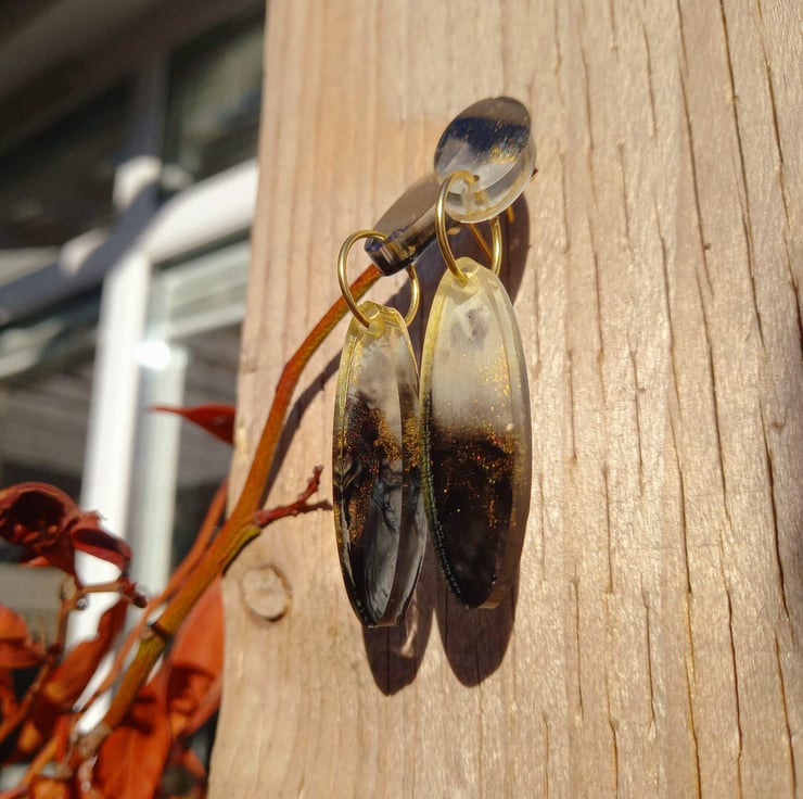 These small oval earrings are handmade with epoxy resin and oval moulds. The colours are made using black, gold and white alcohol ink and hand from a copper wire and posts.