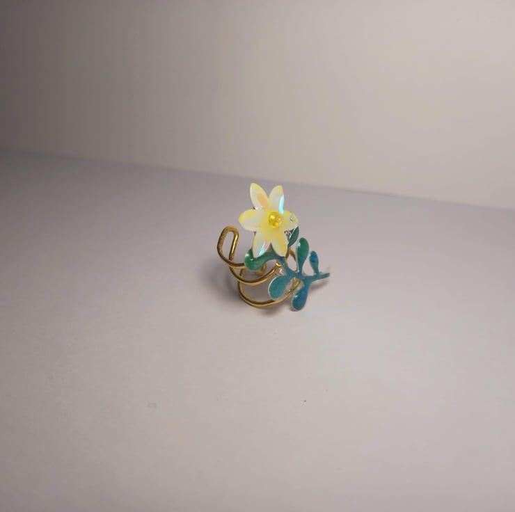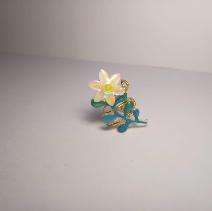 These little daisies have been handmade from card, sequins and UV resin. To finish the daisy, a yellow seed bead is place and the whole thing is secured to a copper wire.