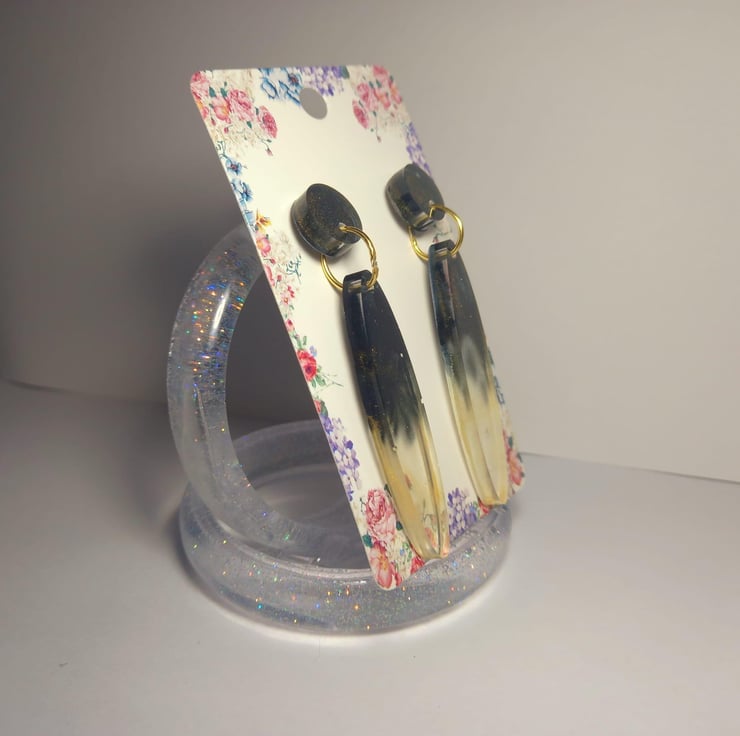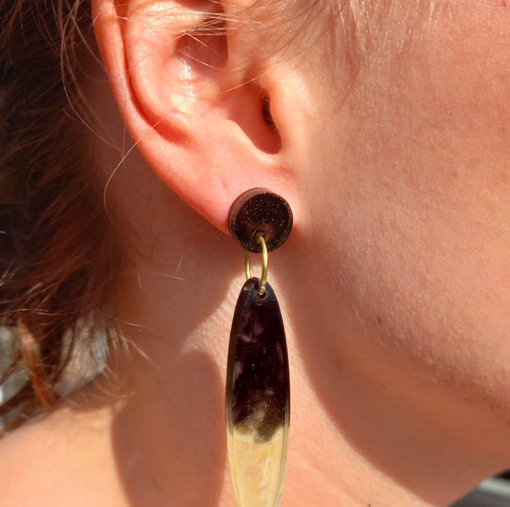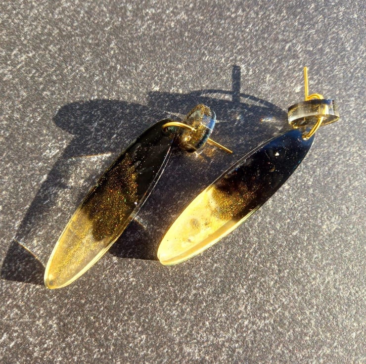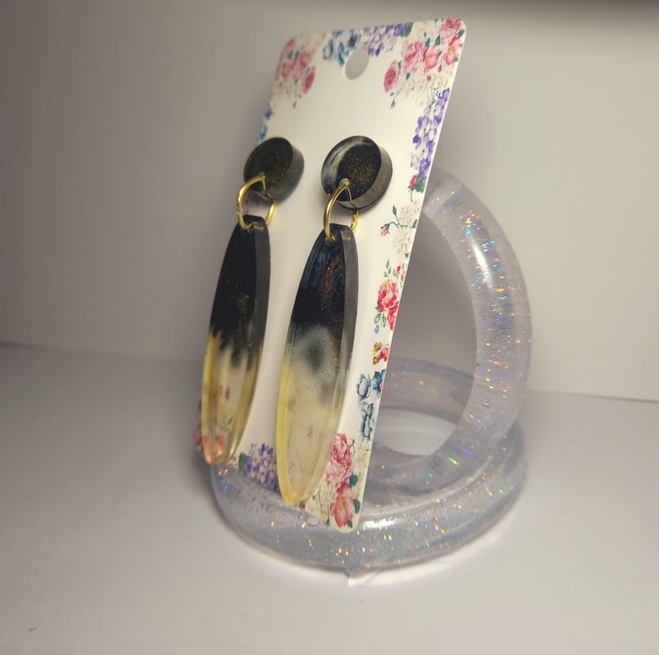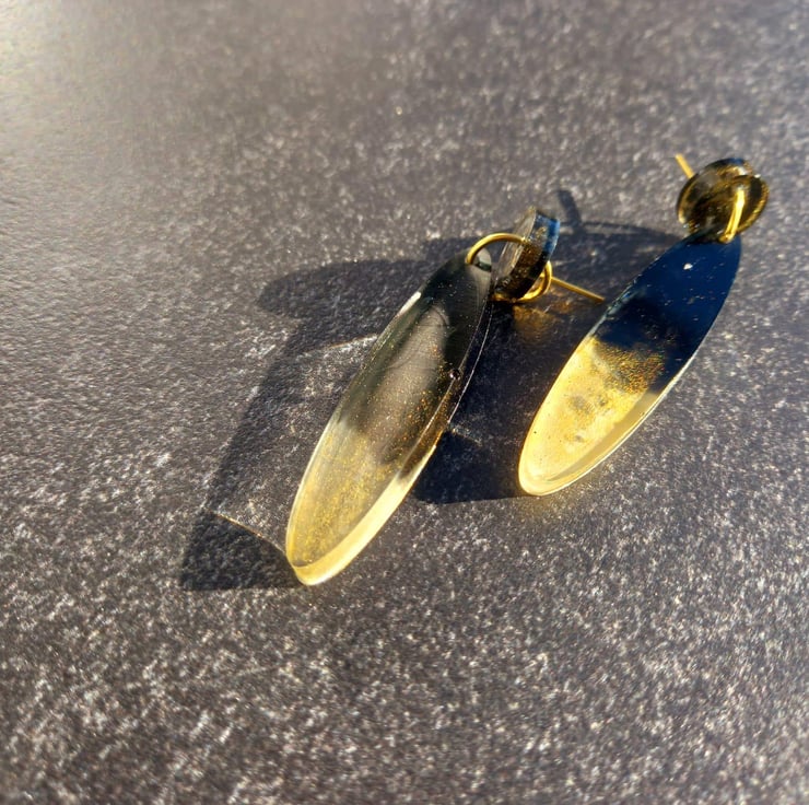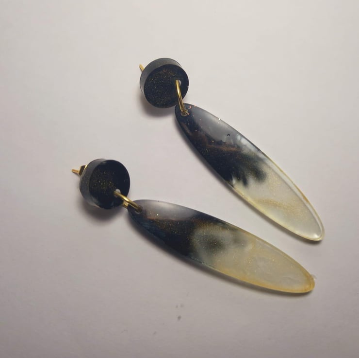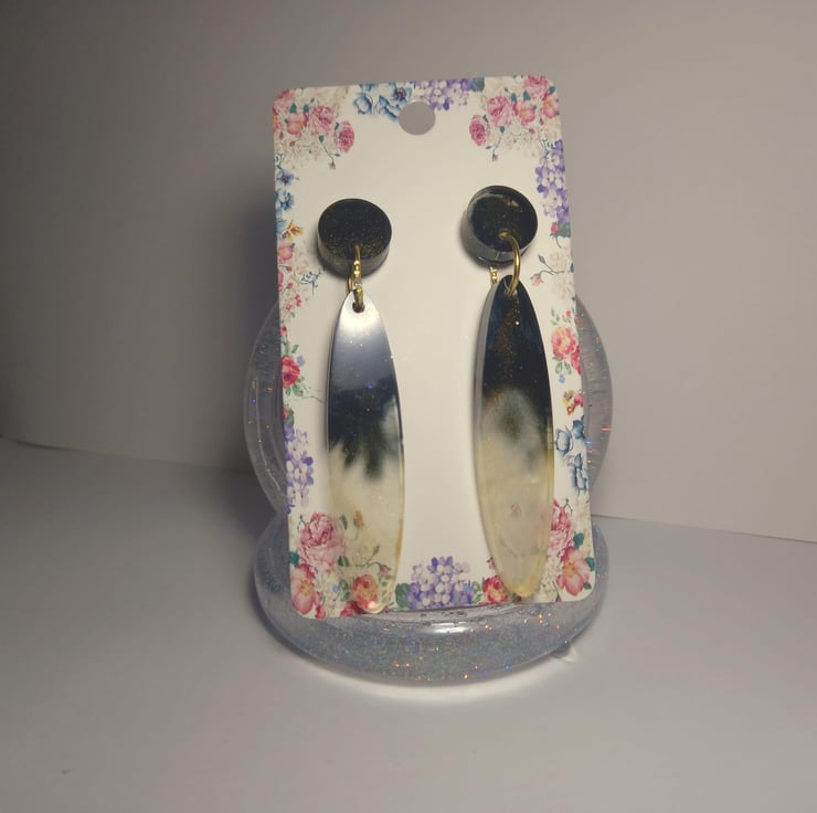 These small oval earrings are handmade with epoxy resin and oval moulds. The colours are made using black, gold and white alcohol ink and hand from a copper wire and posts.