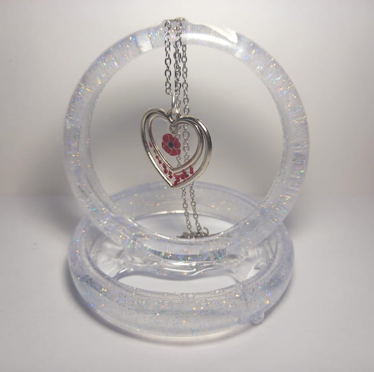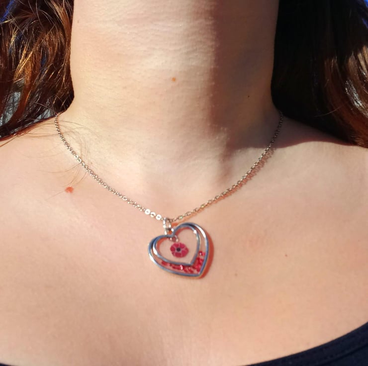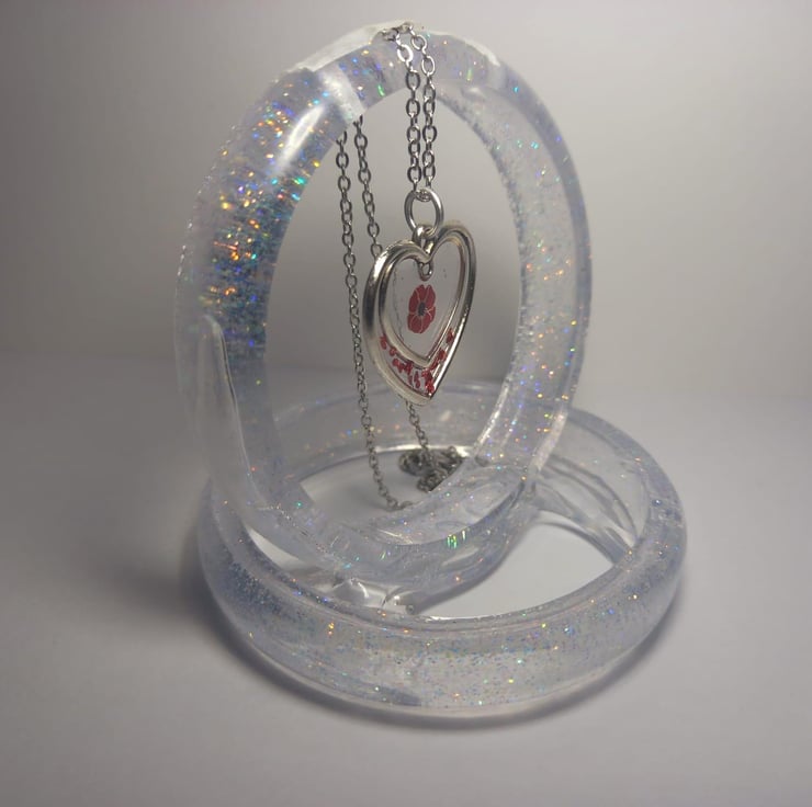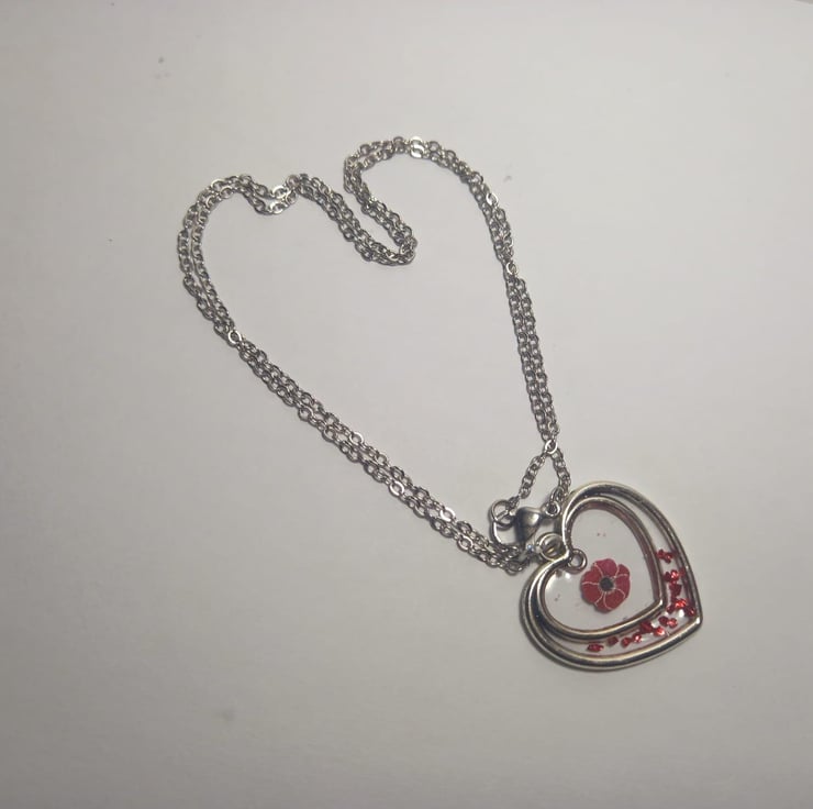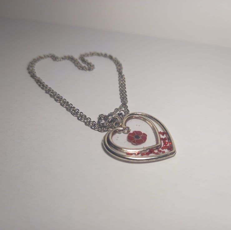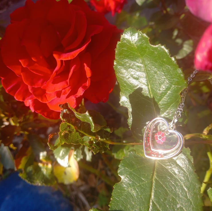 A beautiful heart and red flower pendant, with red flakes of glass and on a stainless steel chain. As this item has been made with UV resin, colour and shape may vary, as well as the colour of the flower.