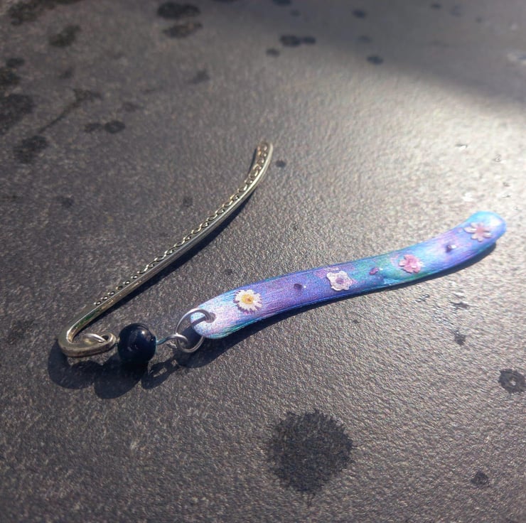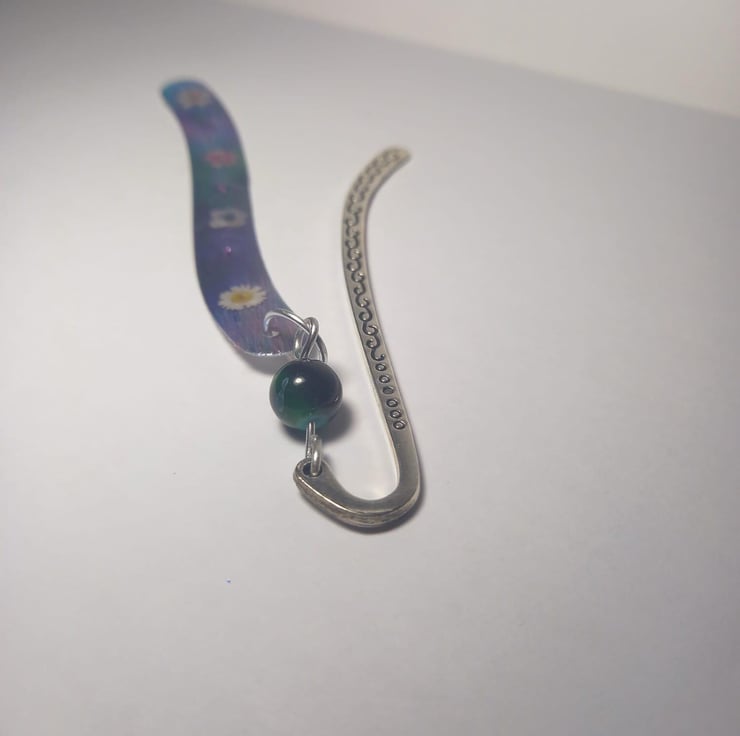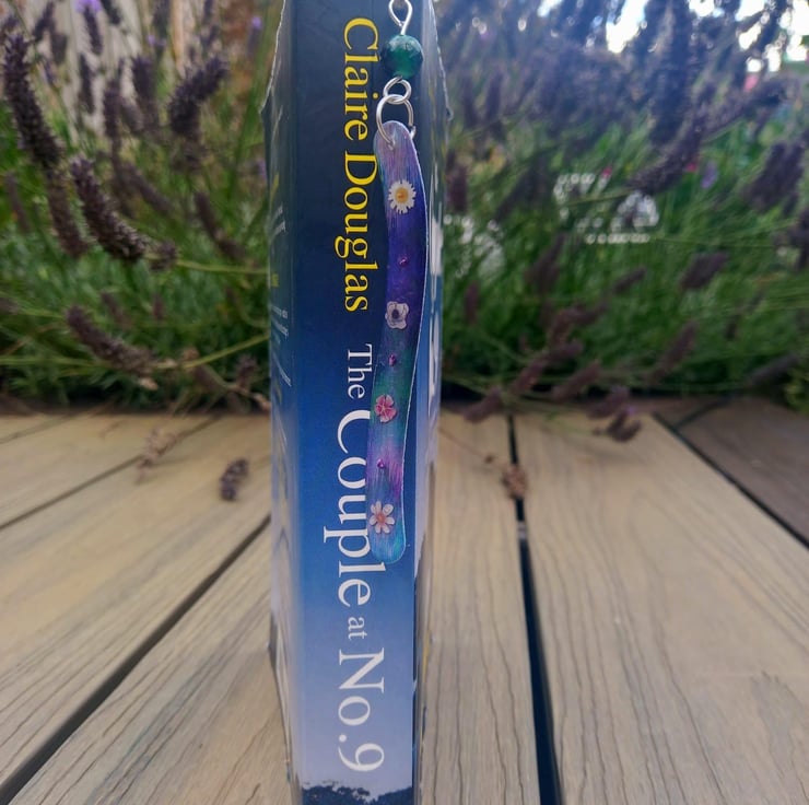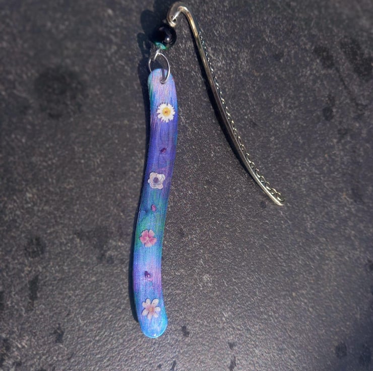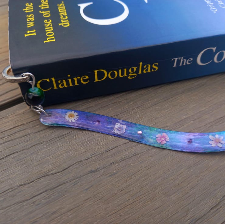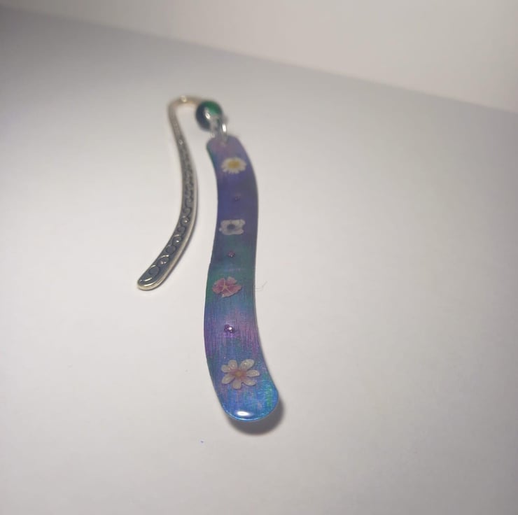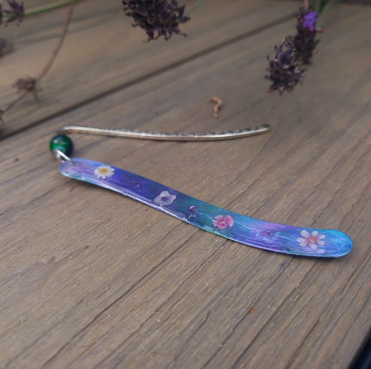 A beautiful piece of card with iridescent purple lavendar in a green field, cut into squiggles and coated in resin. On the card are small white pressed flowers and purple gems.All hanging from a stainless steel hanging bookmark and purple bead.