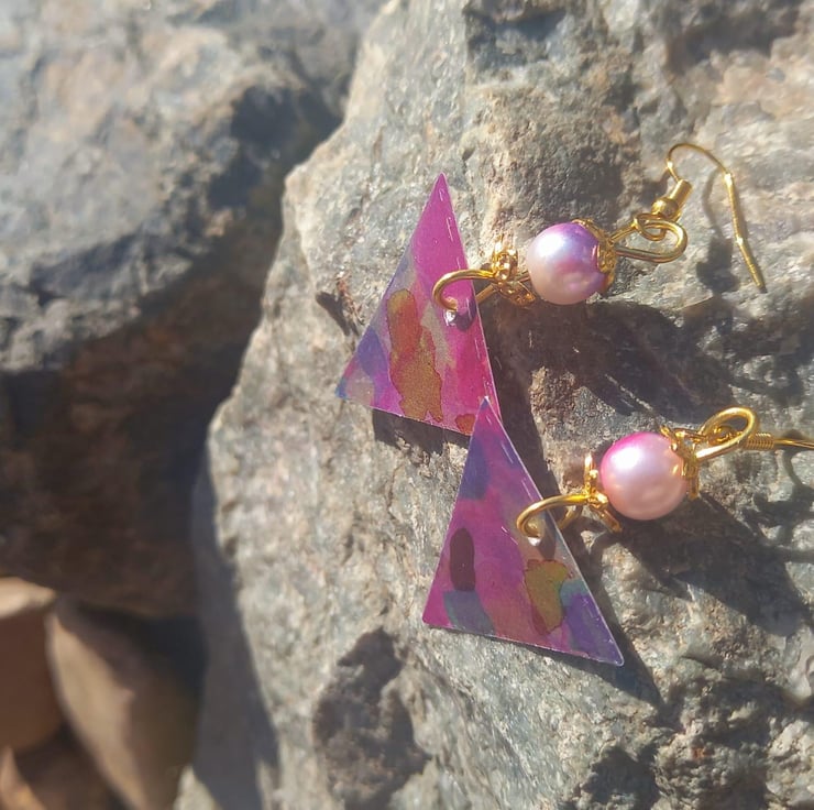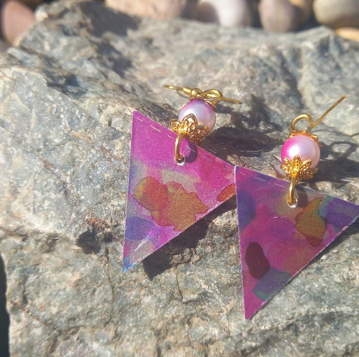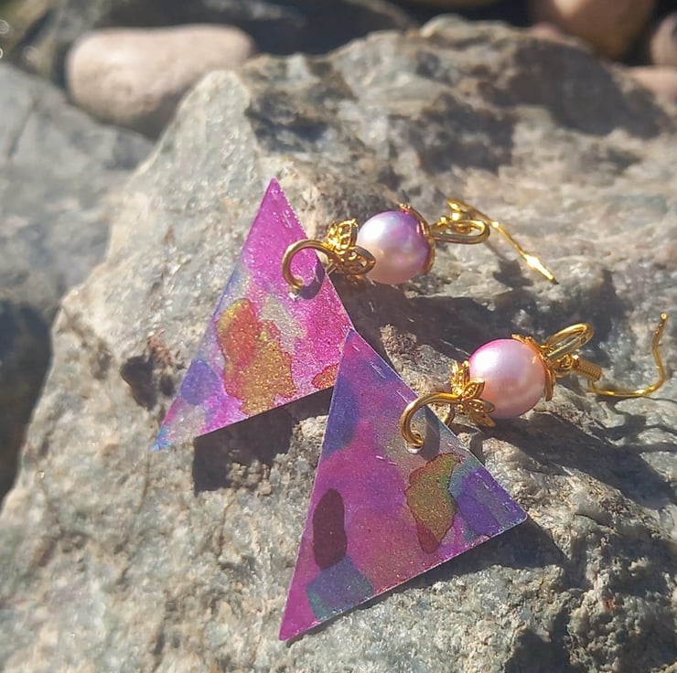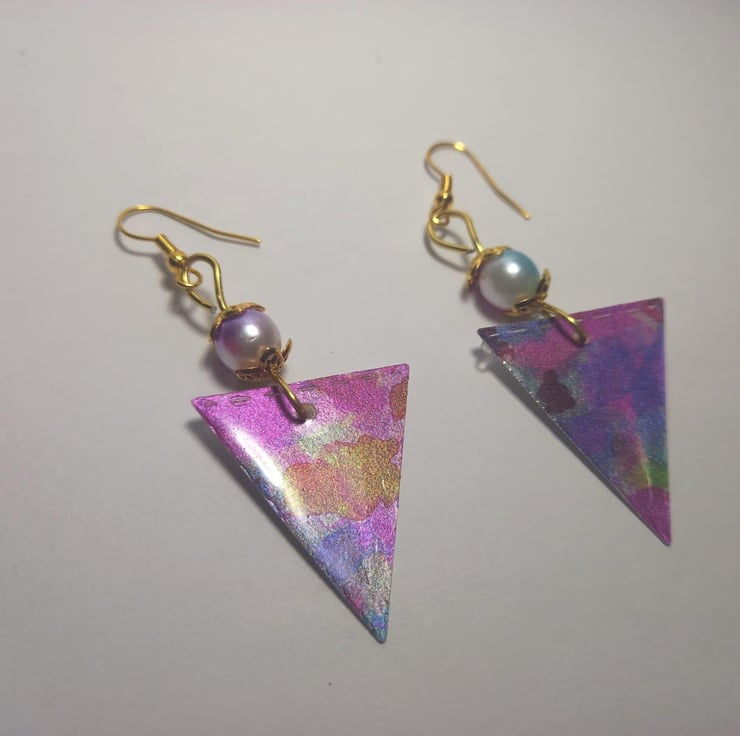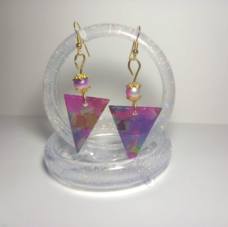 After the successful purple daisy necklace, I thought only right to make some matching earrings. The multicoloured triangle really captures the light with the help of the resin and because of how it is made - these earrings are super lightweight. I don't know about you, but I have some really heavy earrings and sometimes by the end of the day it feels like my ear lobes are dragging on the floor! But these are nice and light but still gorgeous - something you can wear all day in the office and then out to a party afterwards.