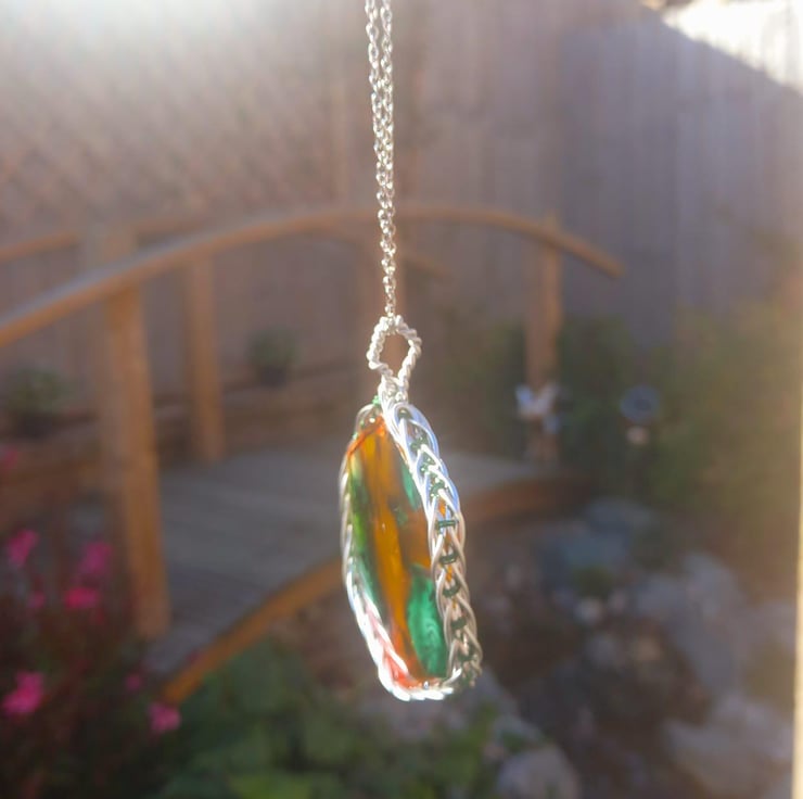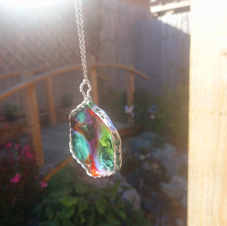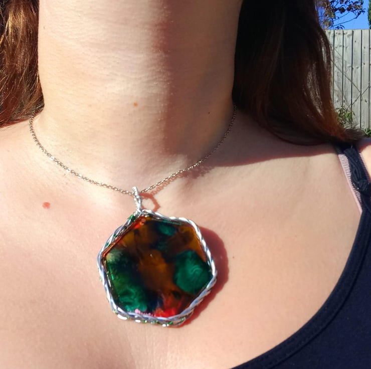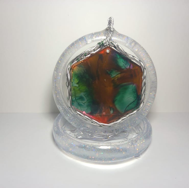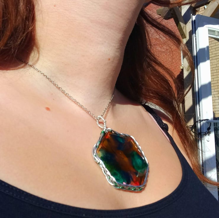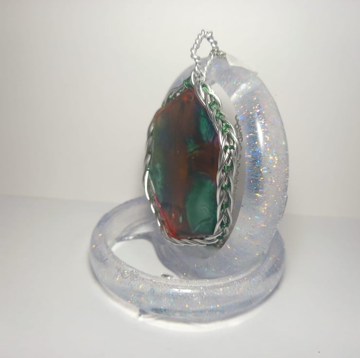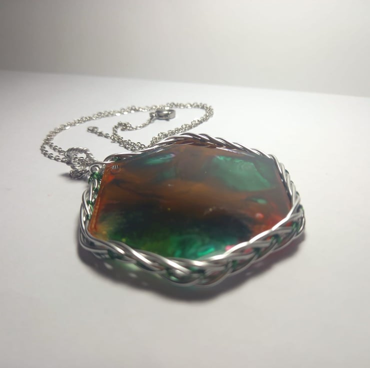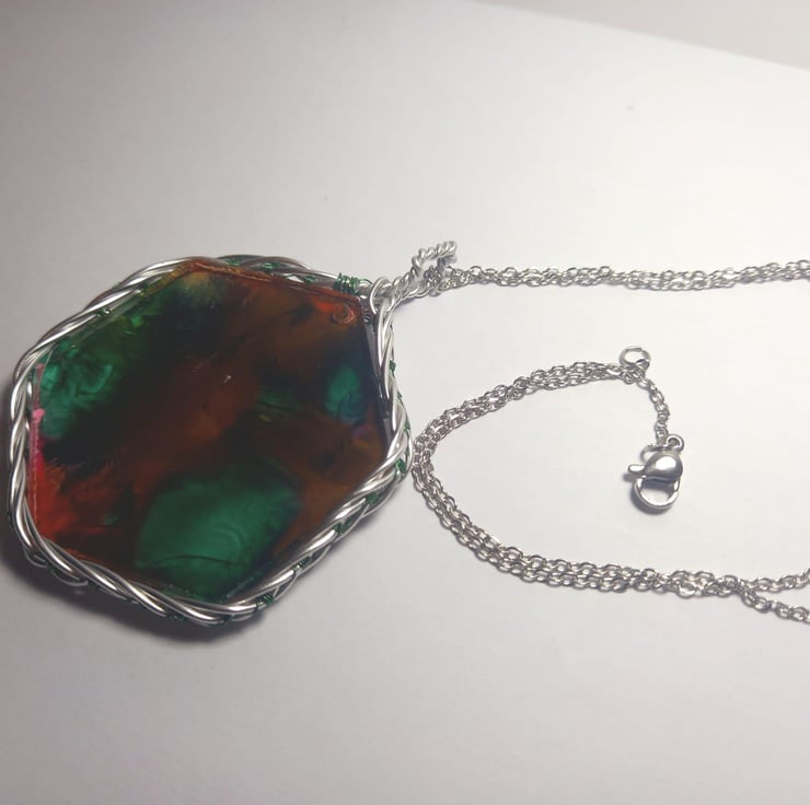 This necklace has been handmade with epoxy resin and a mould. The explosion of colours are made with dark green, peach and dark yellow alcohol inks. The wrapped celtic wire is also handmade from stainless steel wire and some thin green fishing wire.