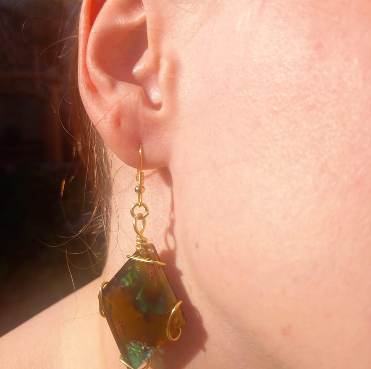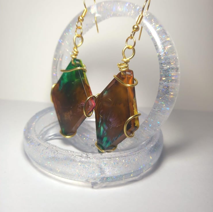 This was another one of my first creations from experimenting with resin. I loved the way the different inks reacted to each other to create a stormy explosion of colour! The dark green and the dark yellow compliment each other perfectly in a pair of earrings that are stubly dynamic. Perfect for an elegant evening out or even a day at the office. The spiral wire around the back shines through the resin too once the light hits it just right.