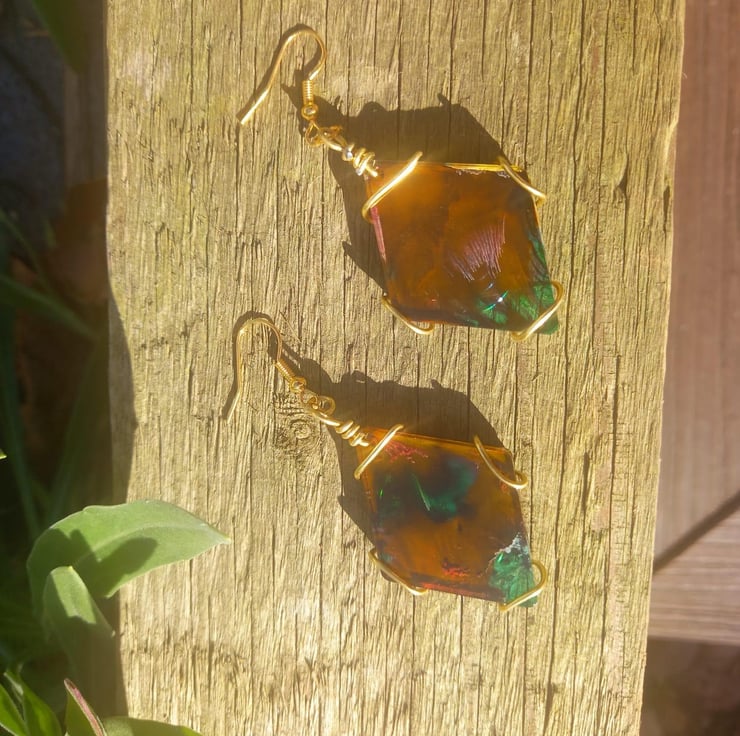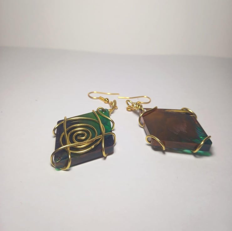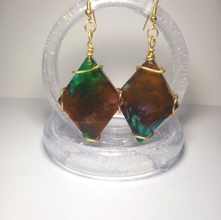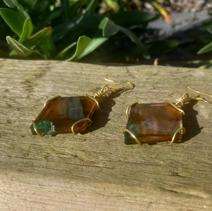 These small diamond shaped earrings are made from epoxy resin and a mould. The colours are an explosion of dark green, peach and golden yellow, which goves them an earthy and rustic look. They are fastened together using copper wire and earring findings.