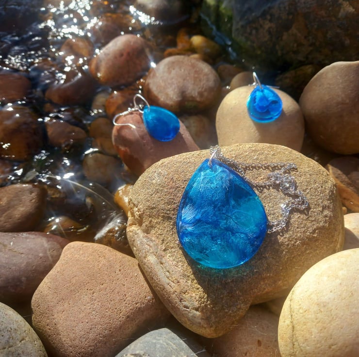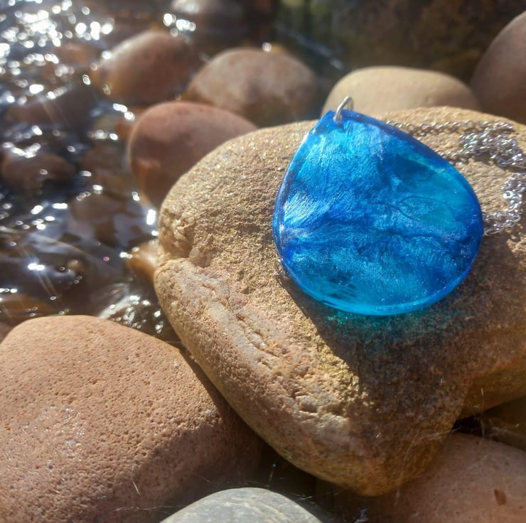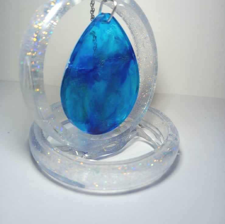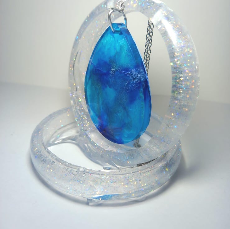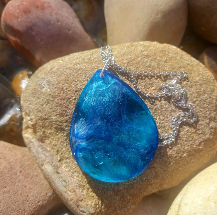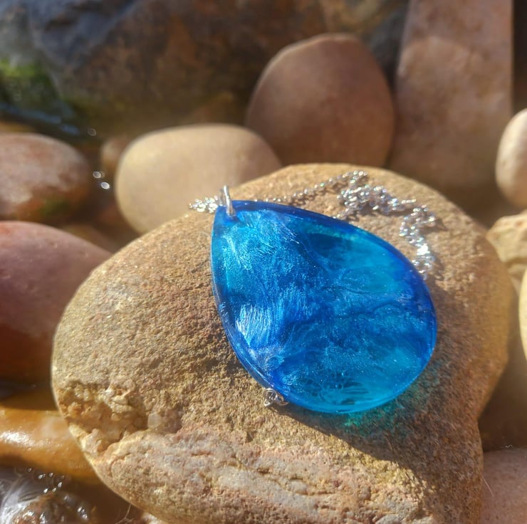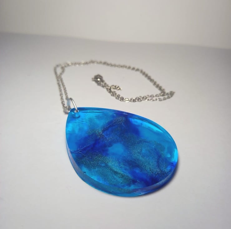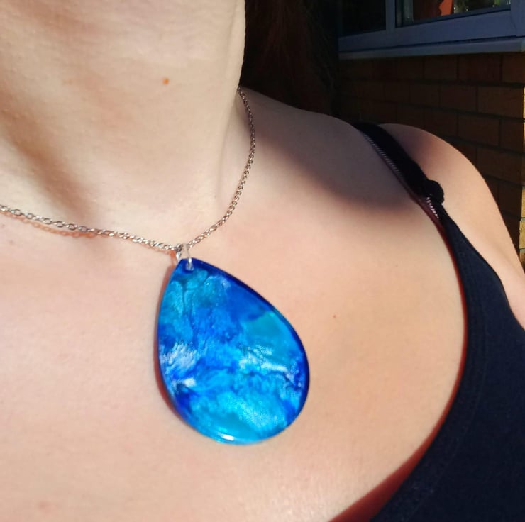 These large tear drops are handmade using epoxy resin and a mould. Within the pendant itself are shades of sapphire blue, sky blue and silver alcohol inks that run together. This tear drop is then attached to a stainless steel wire and chain.