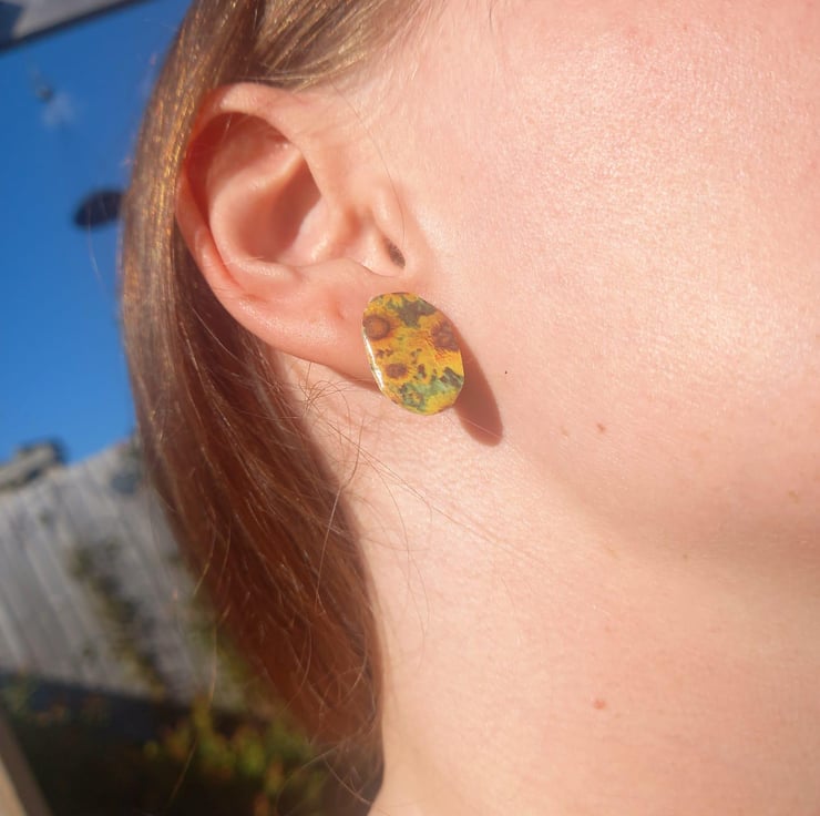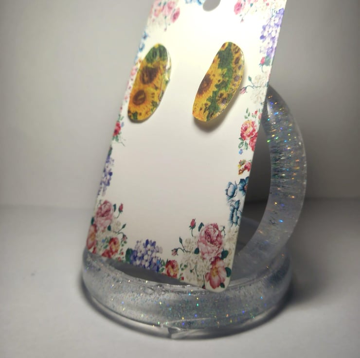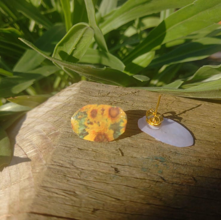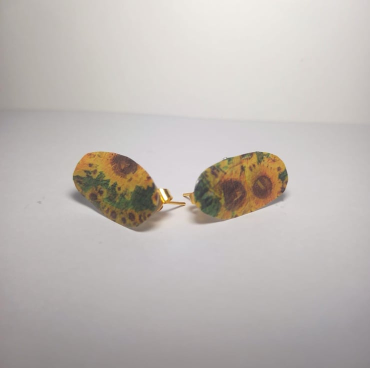 A pair of earrings made from sunflower washi tape and paper, which is then coated in resin to protect the earring. They are attached to copper posts with a butterfly back.
