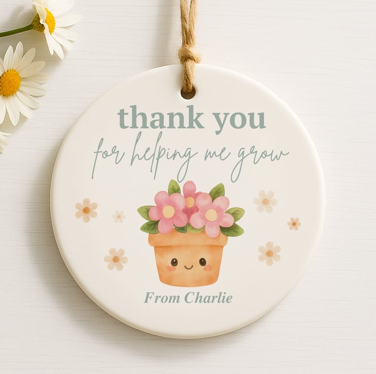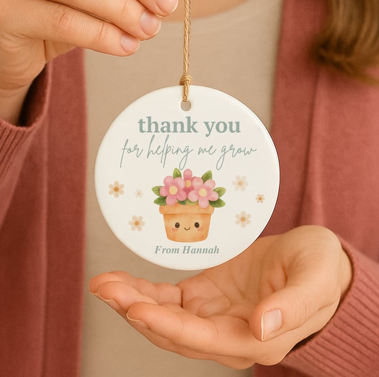 This personalised ornament features an adorable smiling plant pot filled with pastel flowers alongside the message “Thank you for helping me grow”. Add the child’s name to make it a keepsake their teacher will treasure for years.