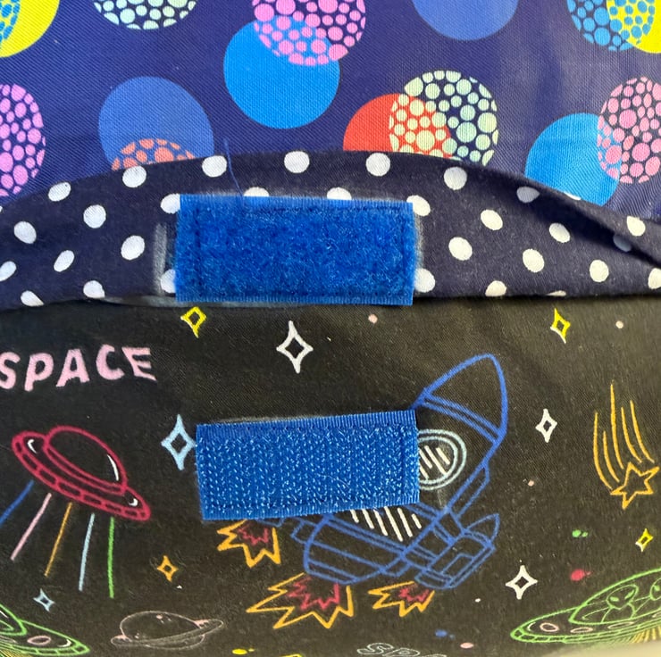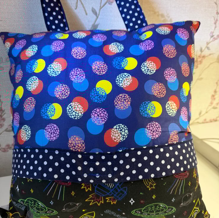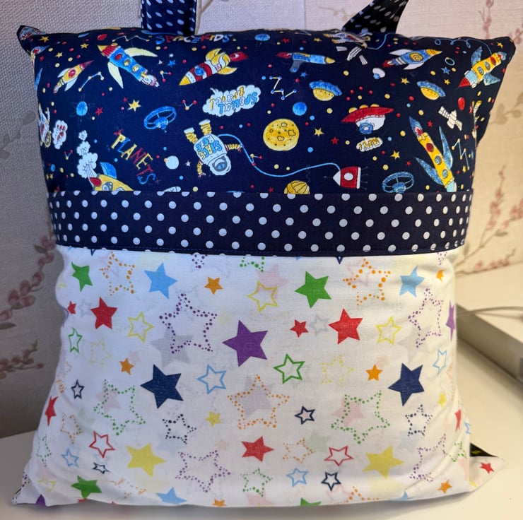 This bright and colourful reading cushion would brighten any child’s bedroom, it has spacemen, planets and spaceships on the top with multicoloured stars on the bottom and a spotty trim. The back has spaceships on the bottom and colourful circles on the top with a spotty trim.