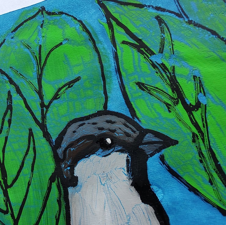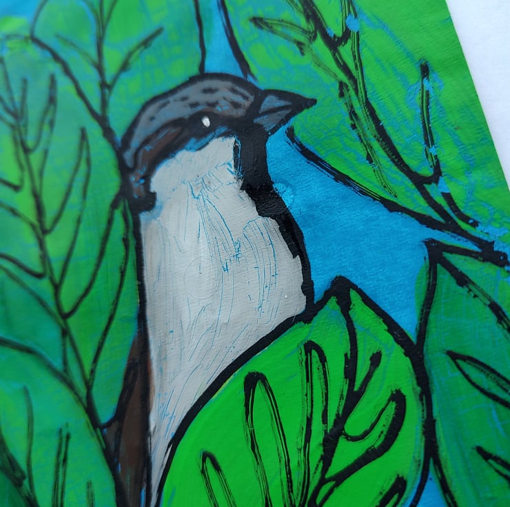Inspired by a lovely morning watching sparrows busying themselves around the laurel bushes planted outside a riverside cafe window, this monoprint aims to capture the bright sunshine and inquisitive nature of the birds.