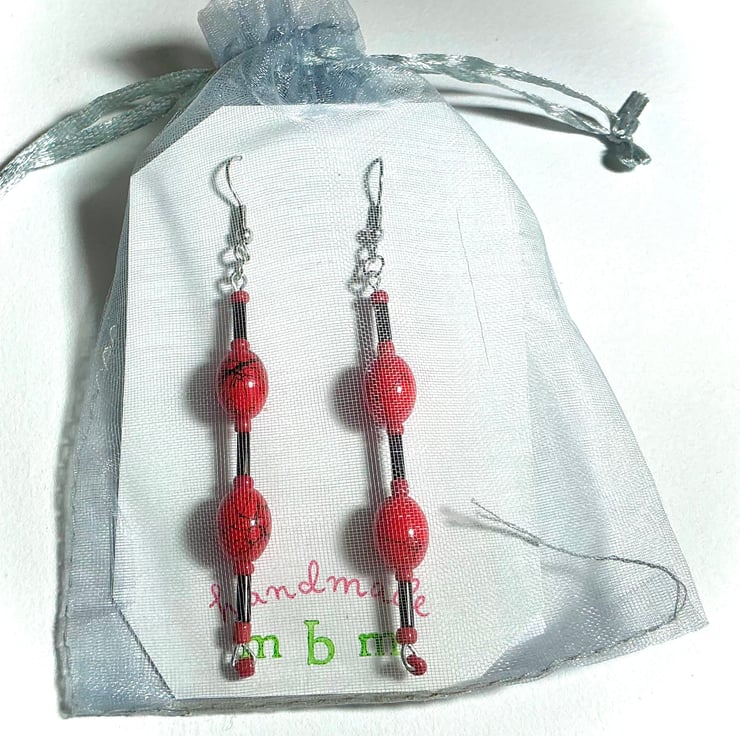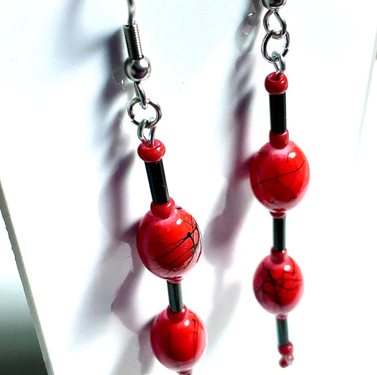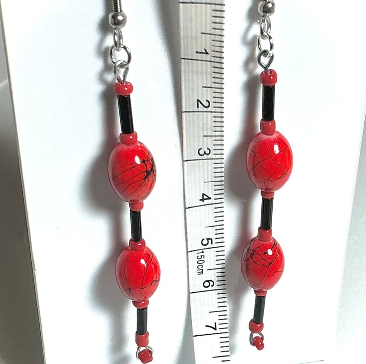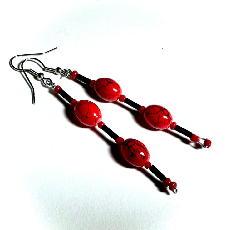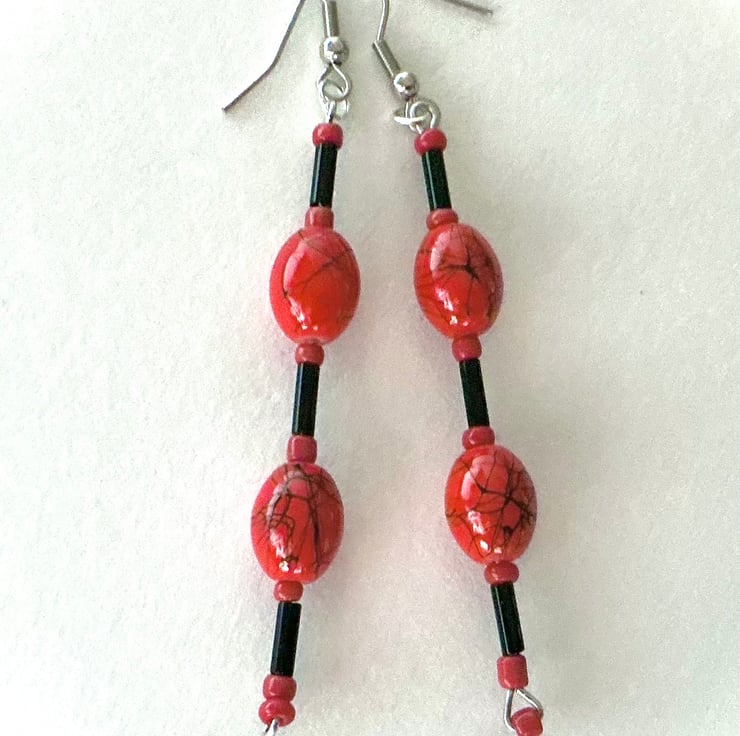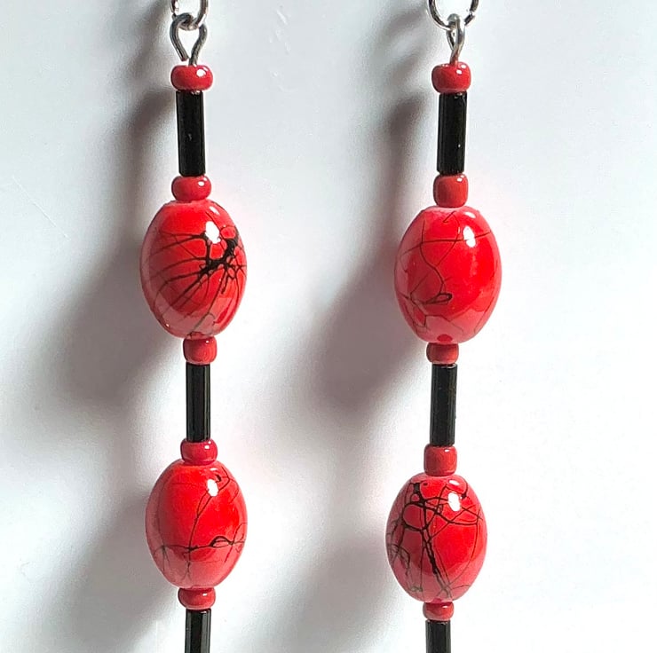 Red oval shaped bead earrings in a long, straight style. Nicely patterned beads with Black spidery lines running through interspersed with Black glass bugle beads and Red seed beads.
