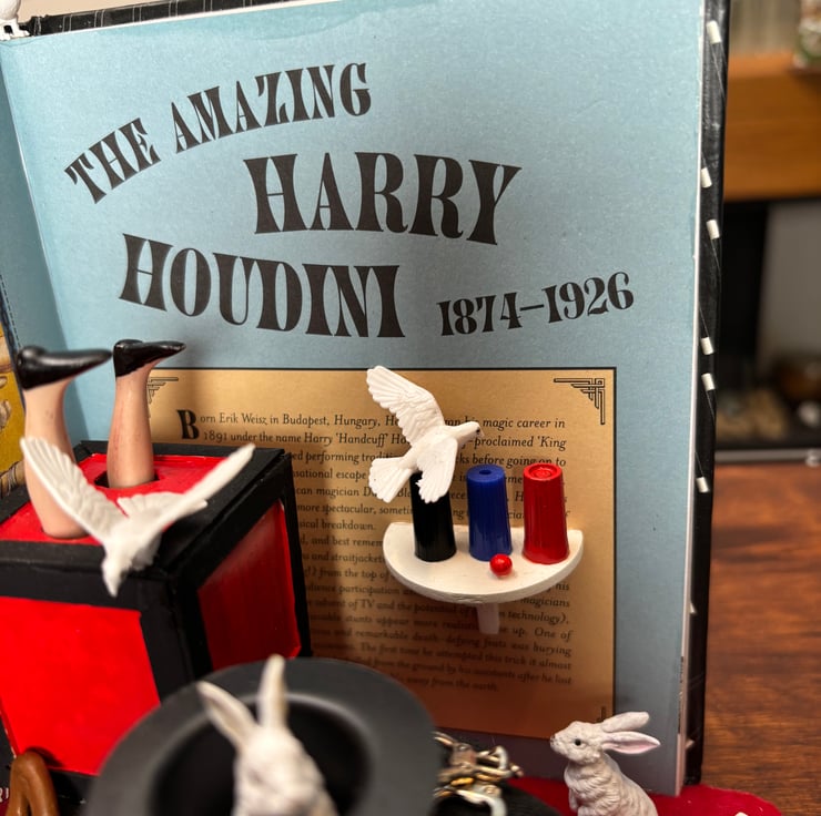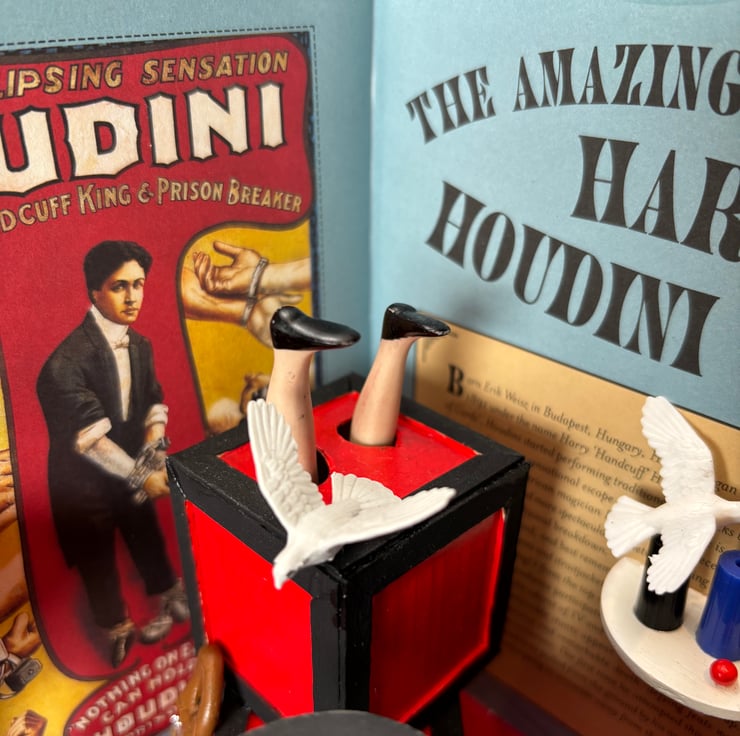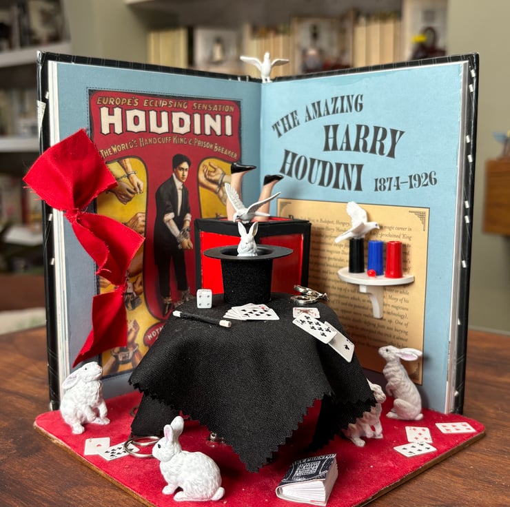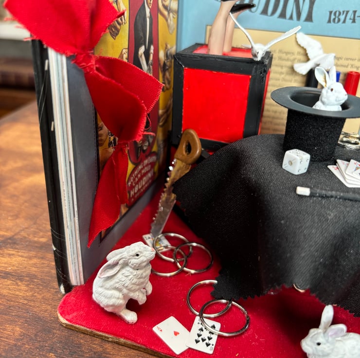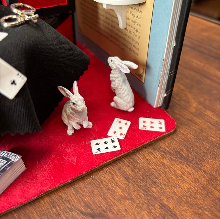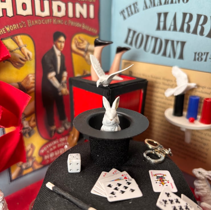 Inside the open theatrical “book”, you’ll find a tiny table draped in black, scattered with playing cards, dice, and a wand mid-trick. A top hat takes centre stage and seems to be producing multiple white rabbits popping up all over, while doves swoop against a backdrop of retro-style magical memorabilia. Every detail is carefully shaped, painted, and arranged to evoke the sense of stepping backstage into a magician’s private world.