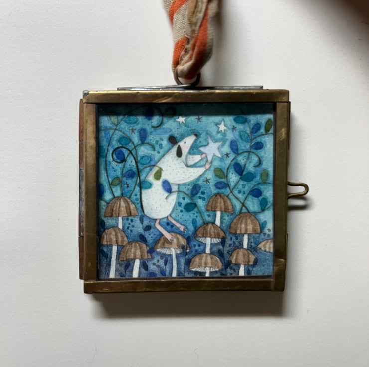 Alight the Sky is an original collectable framed painting presented in a Three Acorns gift box. It measures approximately 5cm square and has a ribbon for hanging.