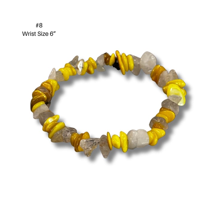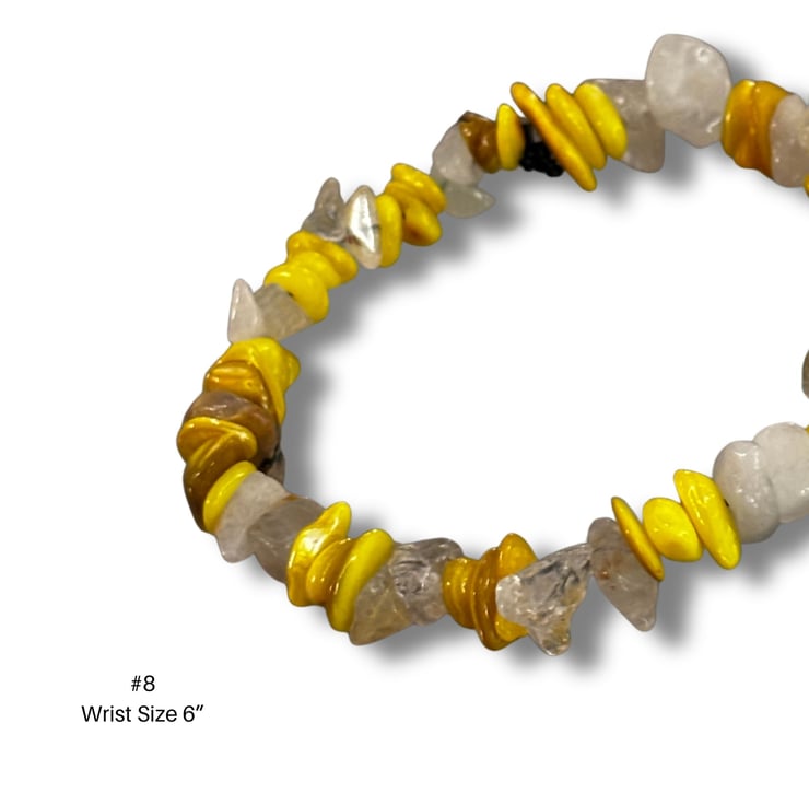 Bracelet 8 is a warm and cheerful design made with yellow toned gemstone-style chip beads. The irregular, natural-style chips create a textured look full of character.
