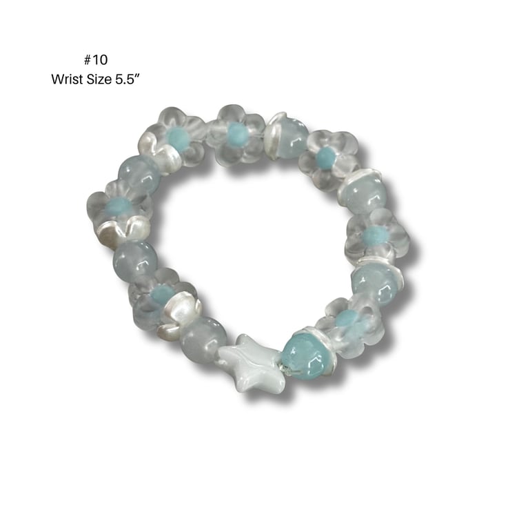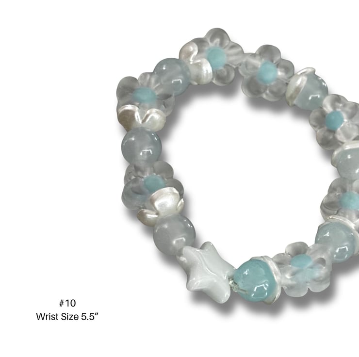 Bracelet 10 is a fresh, delicate design made with transparent beads, icy blue tones and beautiful clear daisy beads. The mix gives a soft, light and clean look, with the daisy shapes adding a pretty floral detail.