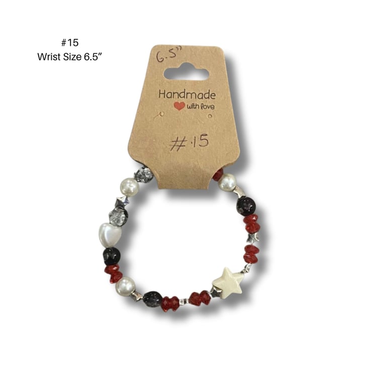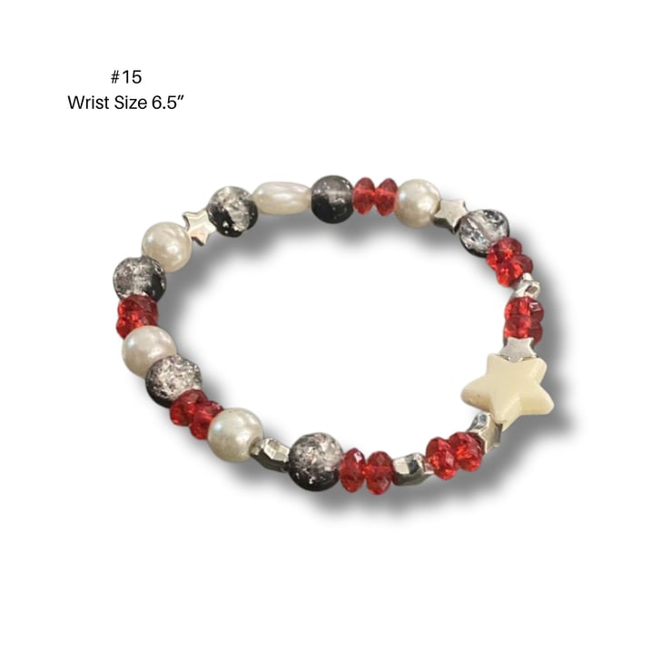 Bracelet 15 – Handmade Grey & Black Crackle Bead Bracelet 6.5” Red Beads & Stars