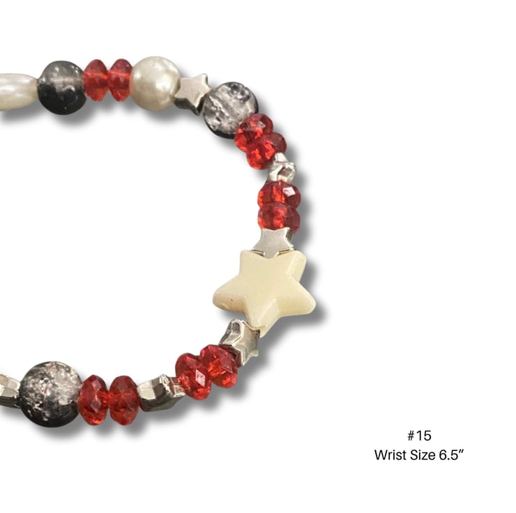 Bracelet 15 is a striking mix of textures and tones featuring grey and black crackle beads paired with bright red diamond-cut beads, small star-shaped beads, and soft pearlescent rounds. The contrast between icy crackle and rich red faceting gives this piece a bold, modern feel with playful, feminine accents.