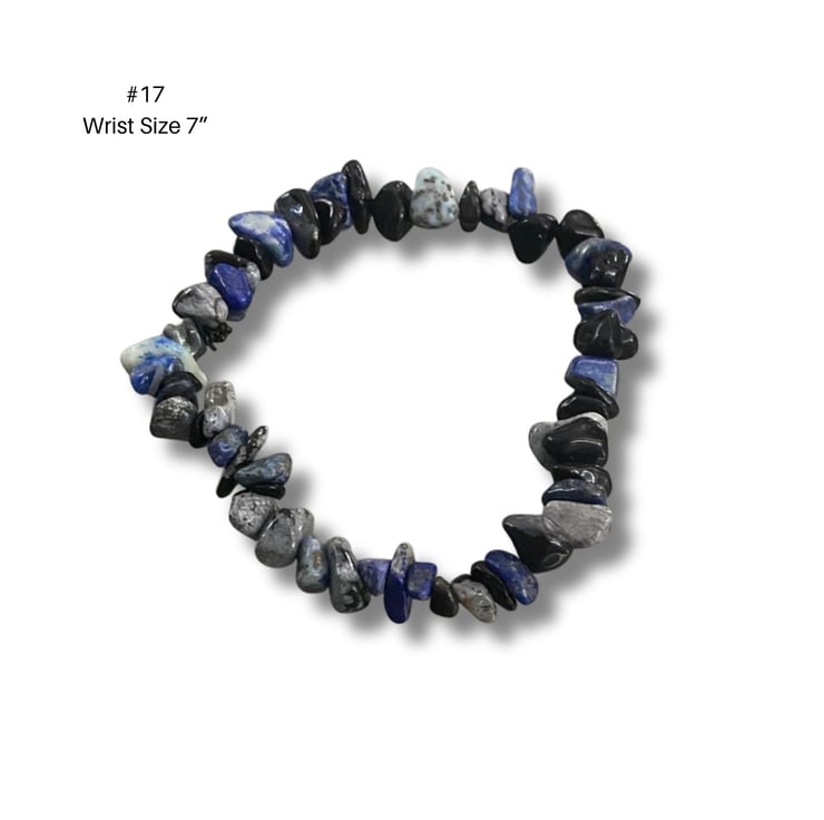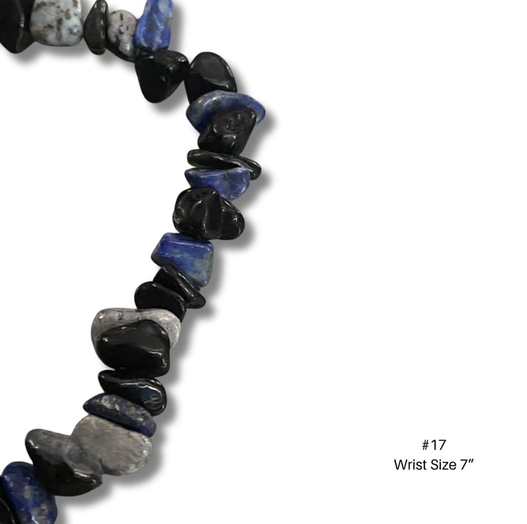 Bracelet 17 is crafted with deep blue, black and grey gemstone-style chip beads, giving it a bold, rich colour palette. The irregular chips create a natural, textured feel.