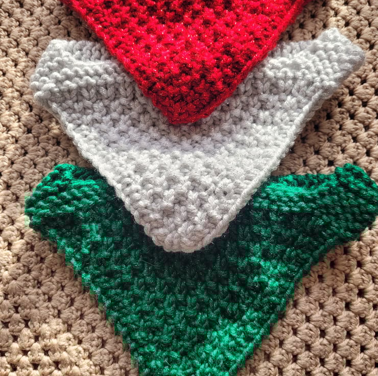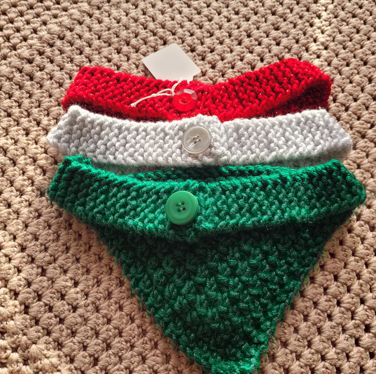 A set of 3. Hand knitted in red ,green and silver sparkle wool. Neck size 18.inches. Will stretch a little bit. Machine washable on low.