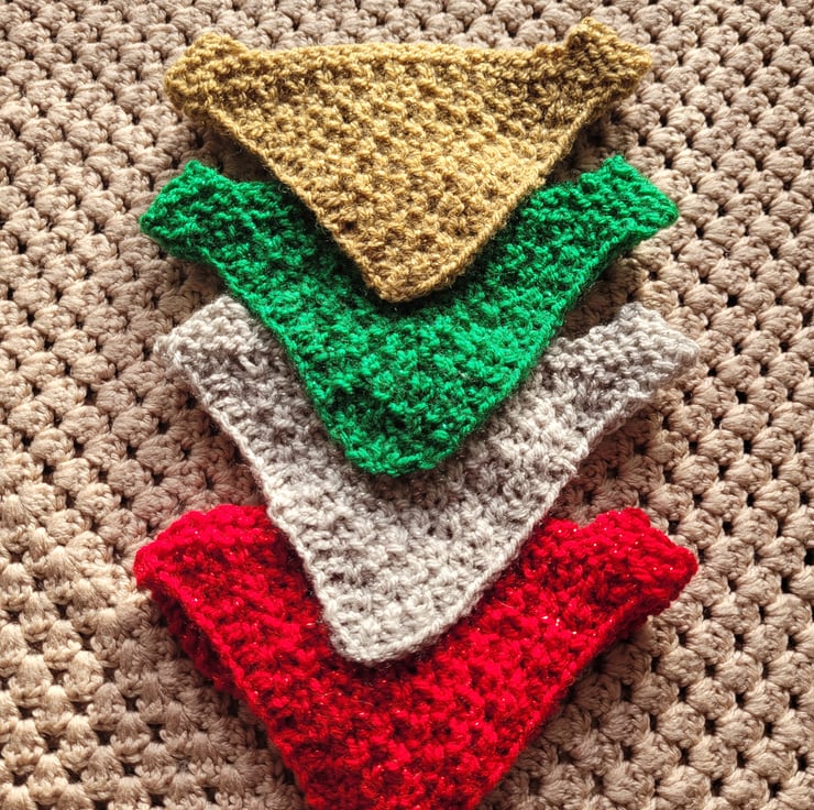 A set of 4. Hand knitted in red ,green, silver and gold . Neck size 13 inches. Machine washable on low.