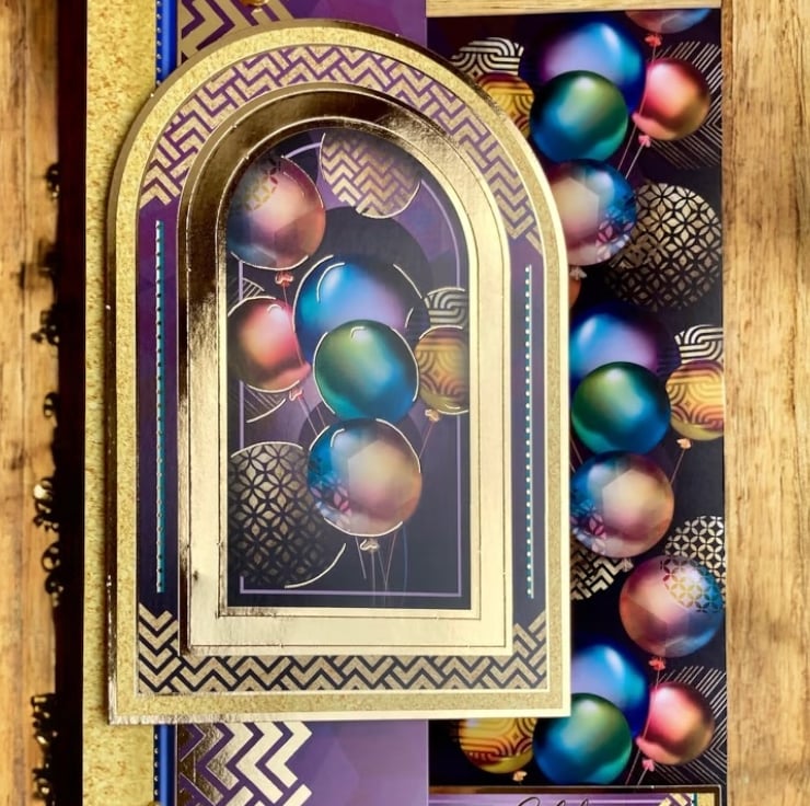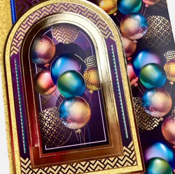 Wish someone a truly unforgettable Happy Birthday with this vibrant luxury birthday card. Measuring 15 x 18 cm, this eye-catching zig zag card showcases a cascade of metallic balloons set against a vivid purple background, creating instant wow-factor.