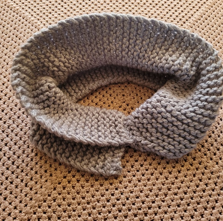 Hand knitted in chunky, soft, ight grey yarn. One size. Machine washable on low.