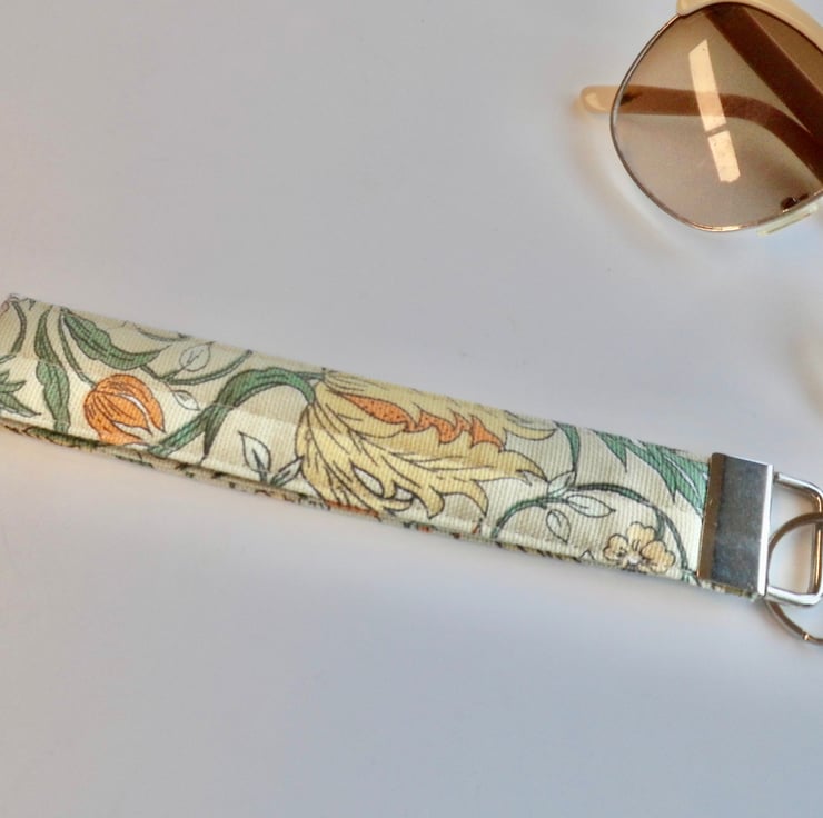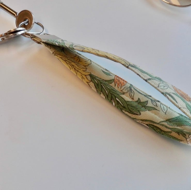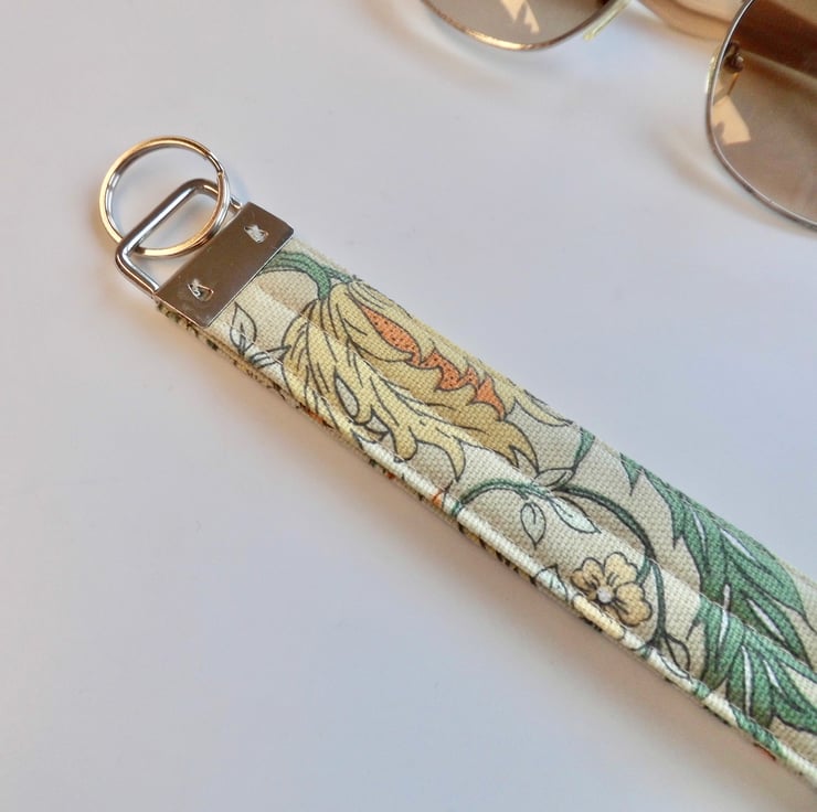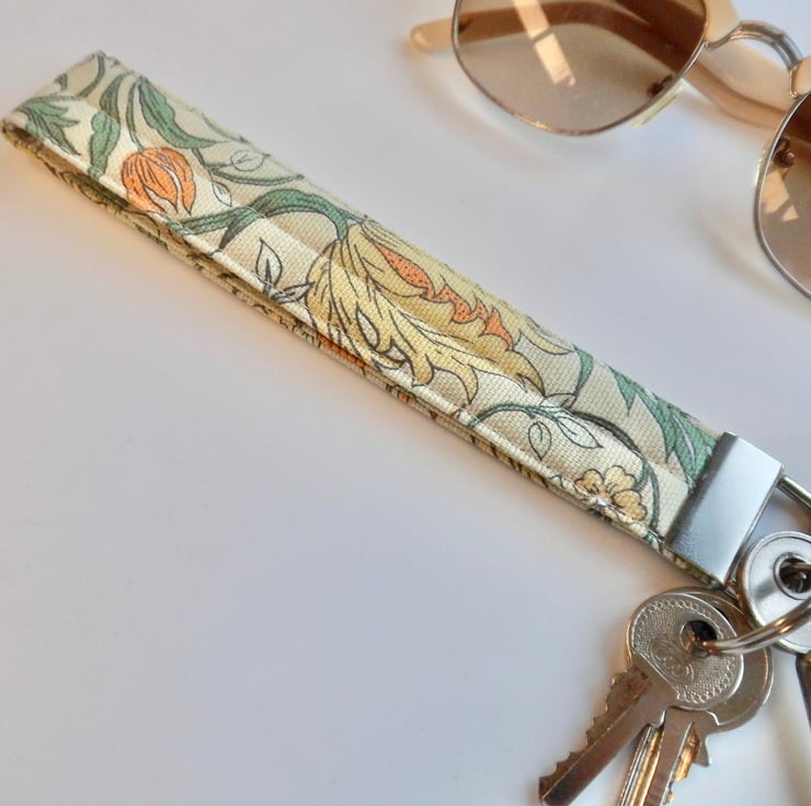 This wrist strap key fob is made using a mid-weight cotton fabric called Wild Tulip which has a beige background and an art nouveau style print of yellow, orange and green. I interlined it to give extra body and strength. Top stitched at the edges and down the centre with beige thread.