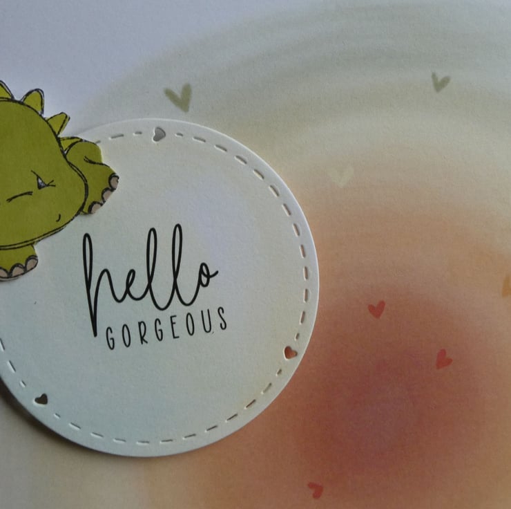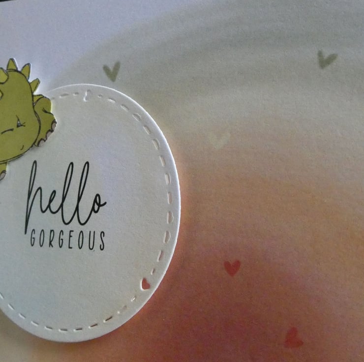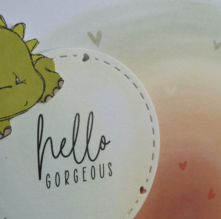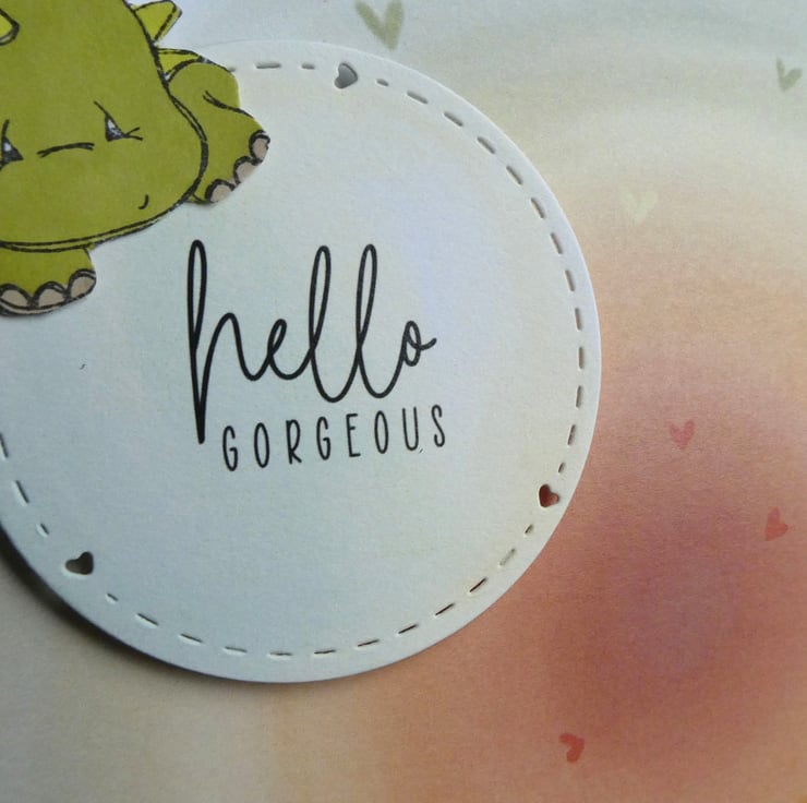 It features a cute dinosaur which has been hand stamped, inked in shades of lime and moss green and carefully cut. It has been positioned to be looking over a circular die cut message with the words 'hello gorgeous'.