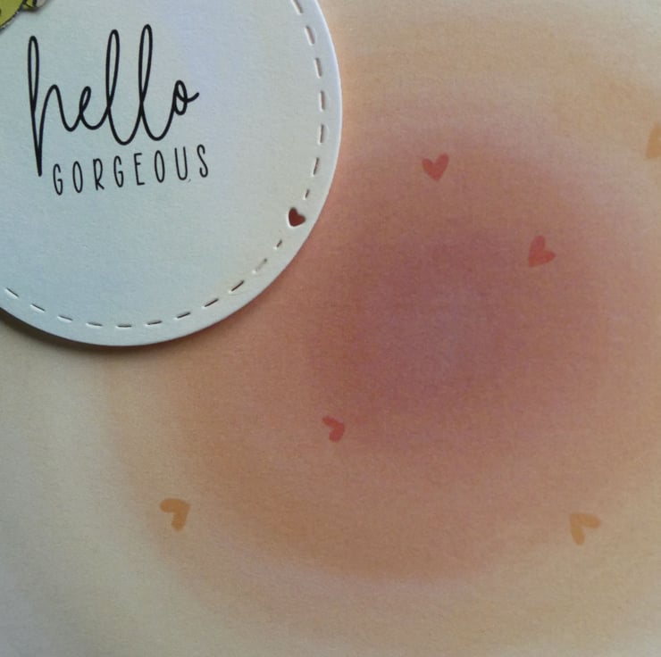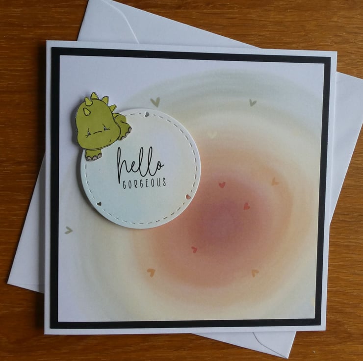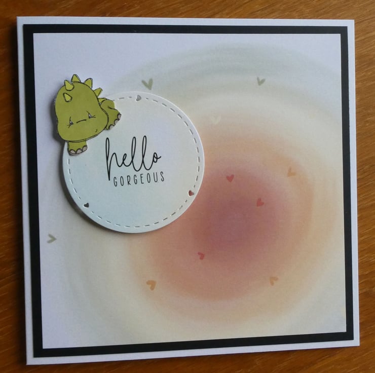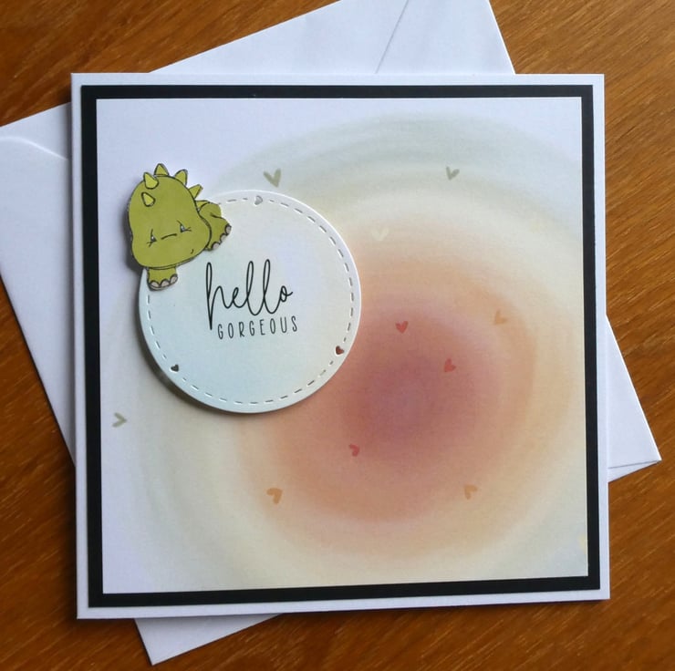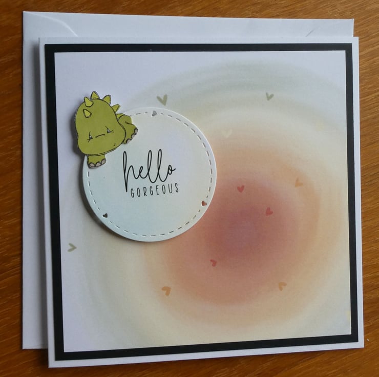 This cute card with a sweet dinosaur and the message 'hello gorgeous' would work equally well as a birthday card or as a Valentines, Anniversary or Just Because card.