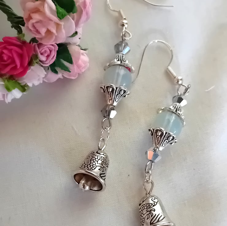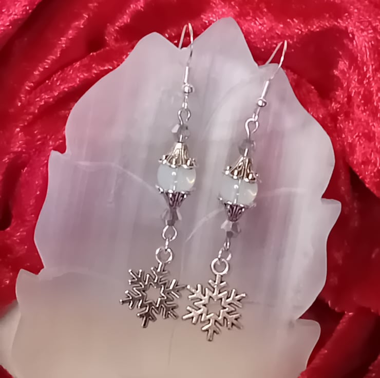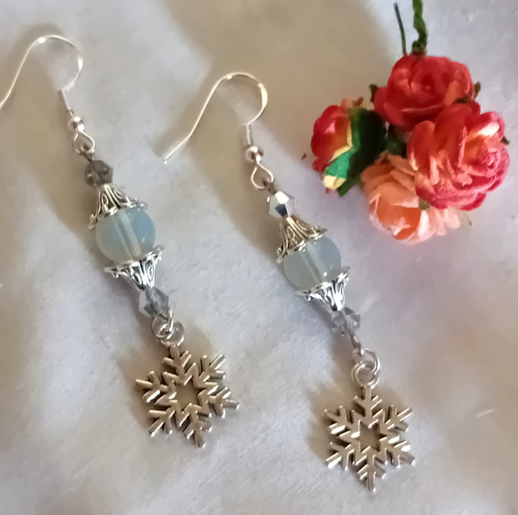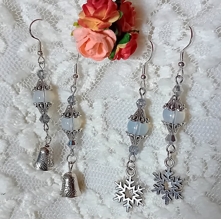 Here we have a cute pair of earrings made with an Opalite gemstone (snowball) Austrian Crystals with a Snowflake or Silver Bell charm. You get 2 in this deal! One of each or 2 of one kind! They have a fish hook design but can also be made with a lever back if preferred.