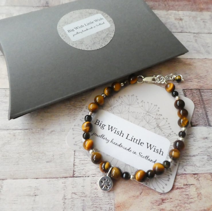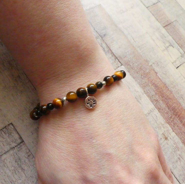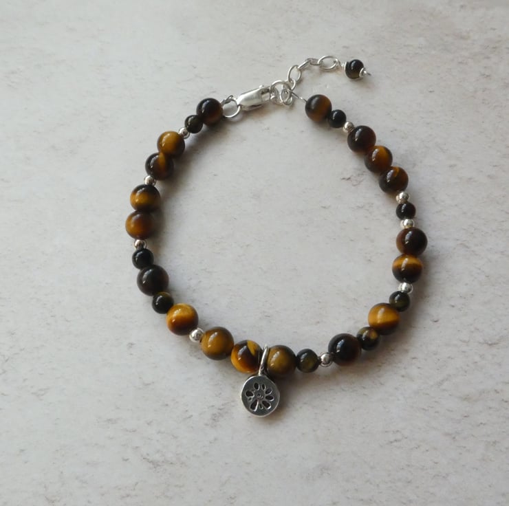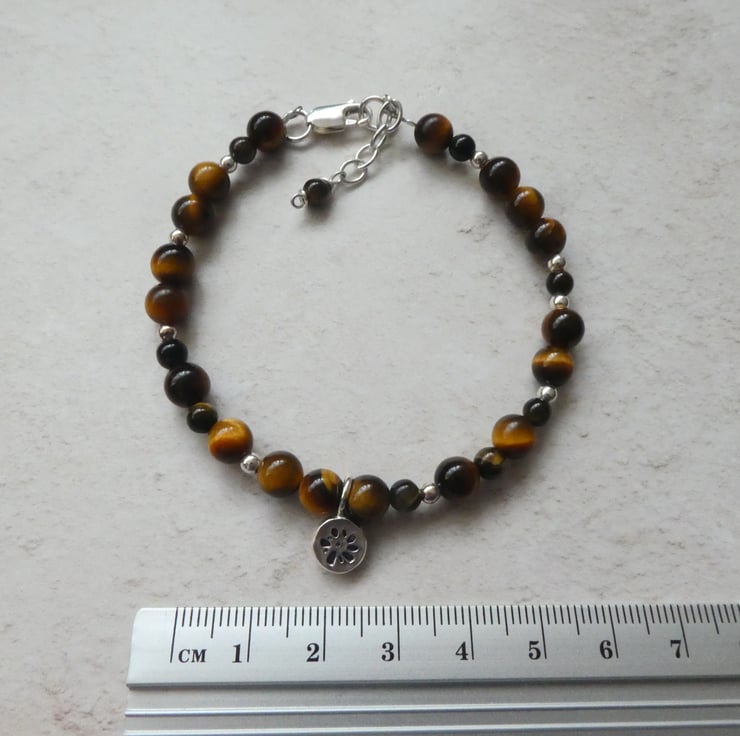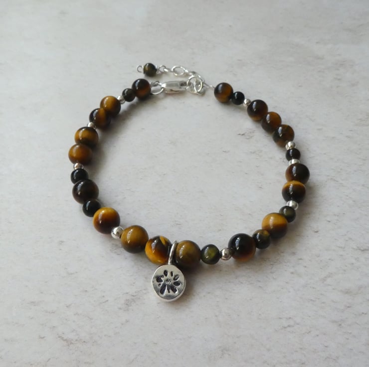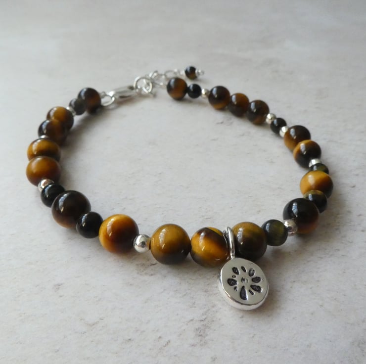 I have made this pretty bracelet to showcase the beautiful tones this stone comes in. It features a selection of beautiful 6 mm and 4 mm tiger's eyes beads interspersed with tiny sterling silver spacer beads. I have finished it with a pretty handmade solid sterling silver charm stamped with a botanical design. The bracelet is strung using Beadalon flexible beading wire which is strong but has exceptional drape for comfort while wearing. It fastens with a sterling silver lobster claw clasp and a 1" (2.5cm) sterling silver extender chain so the fit is adjustable for maximum flexibility. It is approximately seven and a half inches long (19 cm) The photos show the exact bracelet you will receive. Please check all sizes carefully as I often use close up photography to show the detail of my work.