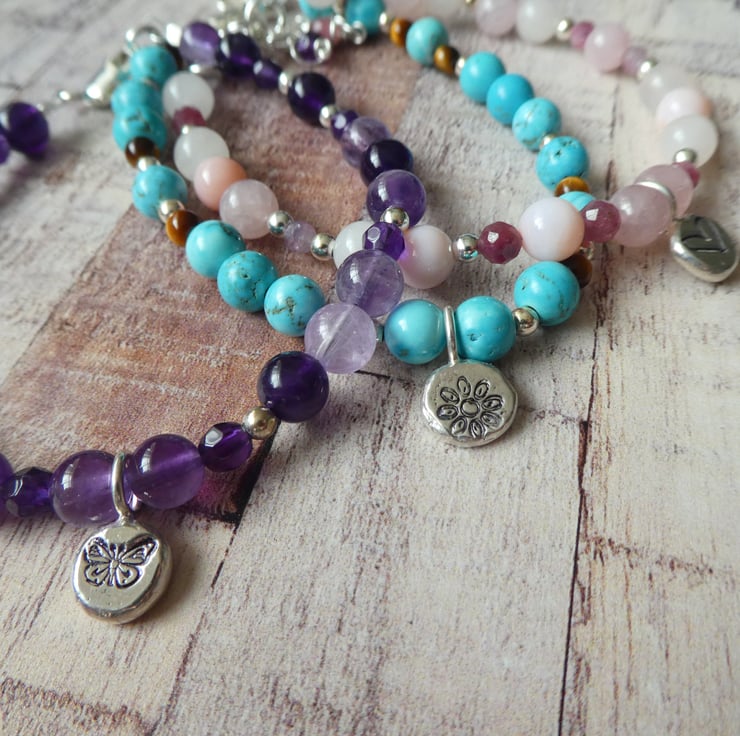 I like to recycle as much of my silver scrap in my studio as possible- these little charms are made from approximately 1g of sterling silver odds and ends, melted down and reformed into little charms which are then hand stamped or impressed with various designs. These bracelets are the perfect way to showcase my little charms and make great stacking jewellery.