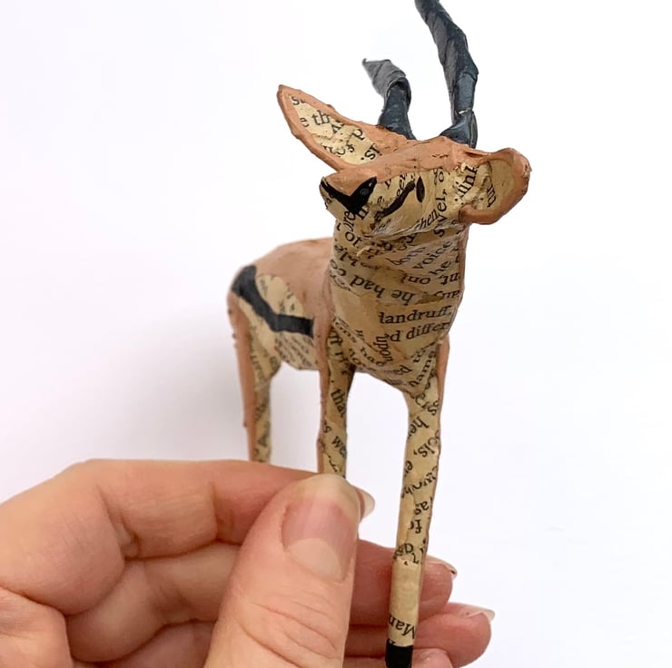 Miniature African Thomson's Gazelle wildlife antelope deer sculpture ornament handmade out of recycled vintage book pages and hand painted